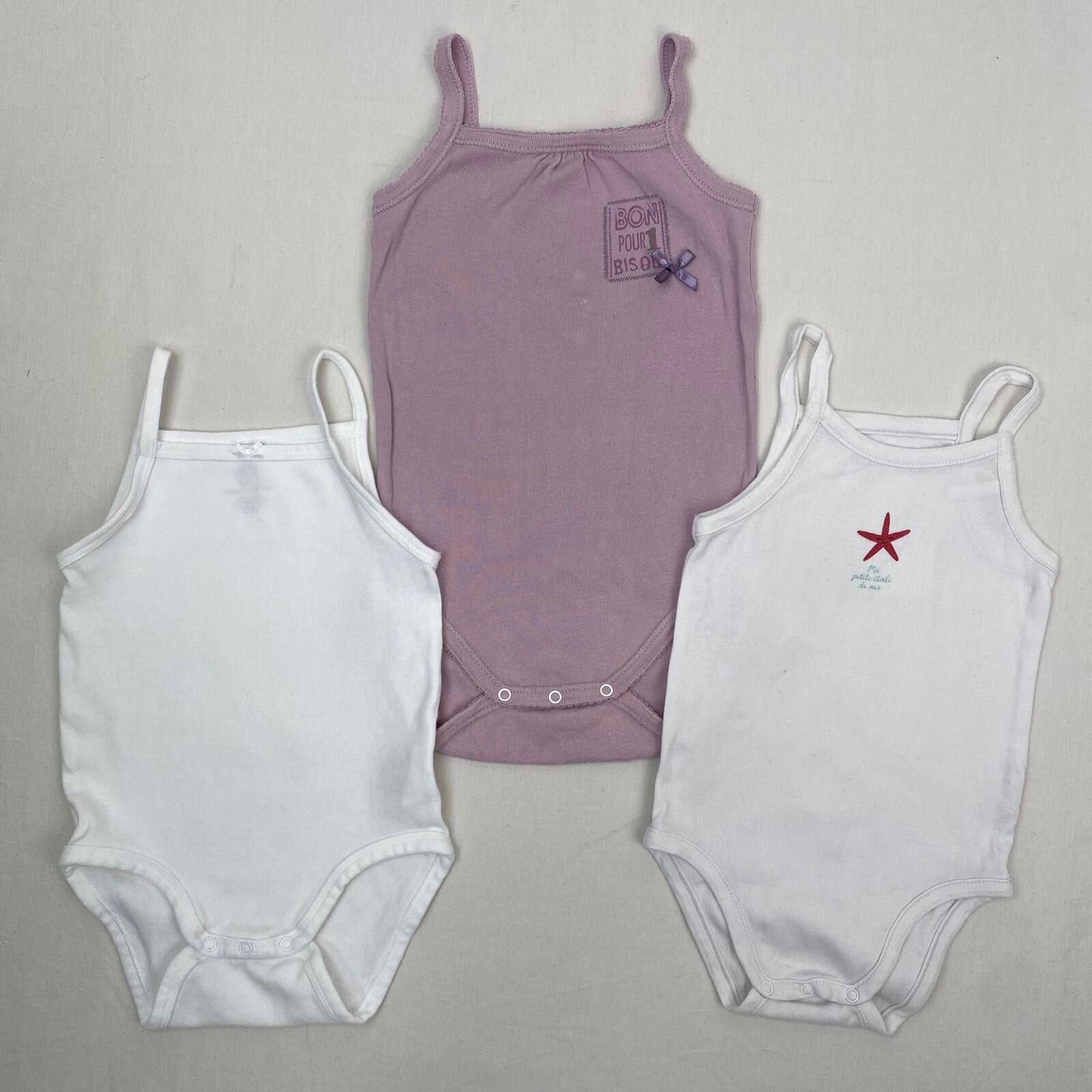 Lot de 3 bodys à bretelles: – Blanc uni H&M. – Blanc uni Bout’chou, motif étoiles de mer rouge et inscription « Ma petite étoile de mer ». – Violet lavande uni Absorba, noeud assorti sur le devant et inscription « Good for kisses ».