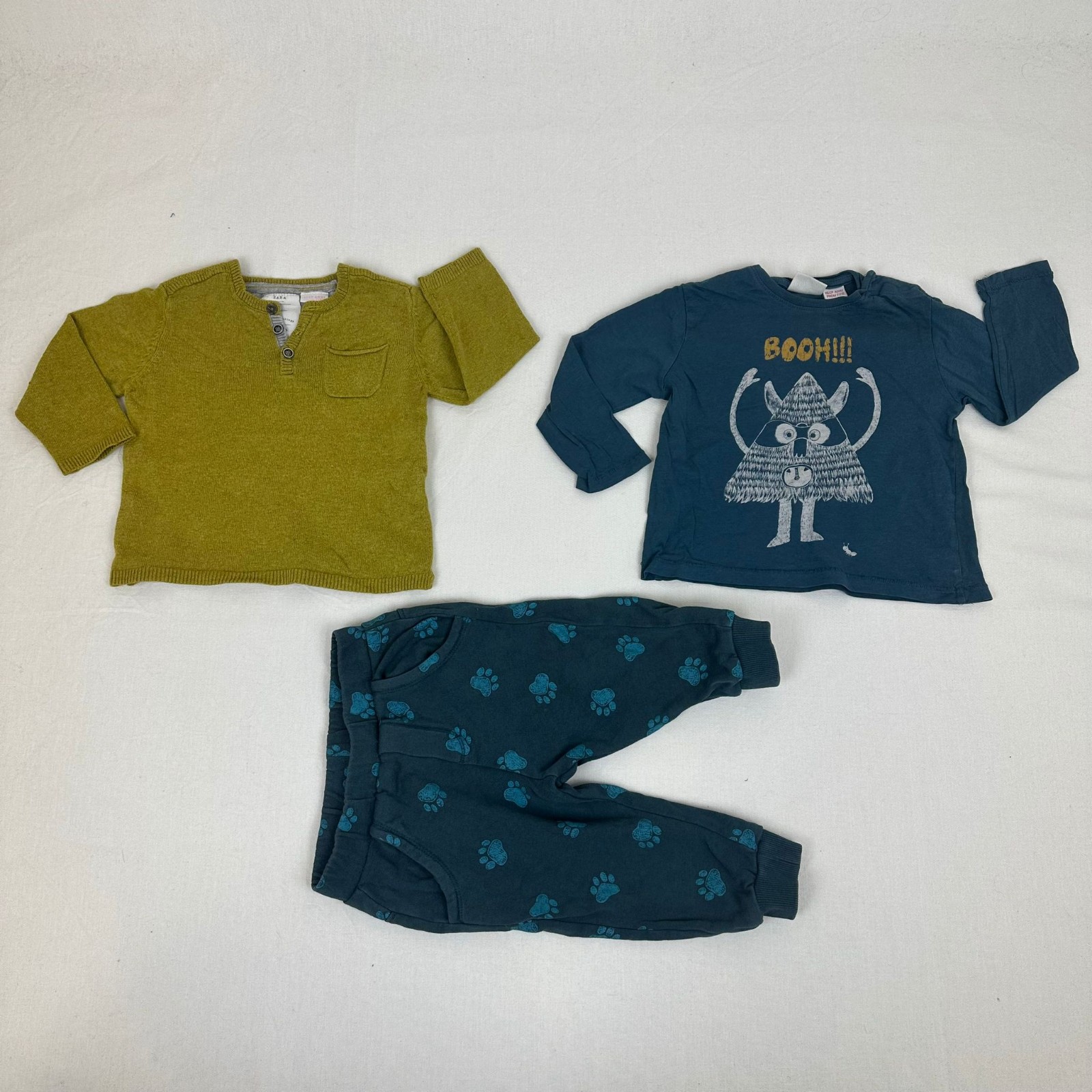 Autres commentaires : Jogging Blukids bleu avec motif patte de chat et taille élastiquée. Pull jaune moutarde Zara avec col tunisien. T-shirt Zara manches longues bleu avec motif animal et une fermeture à l’épaule par boutons pressions.