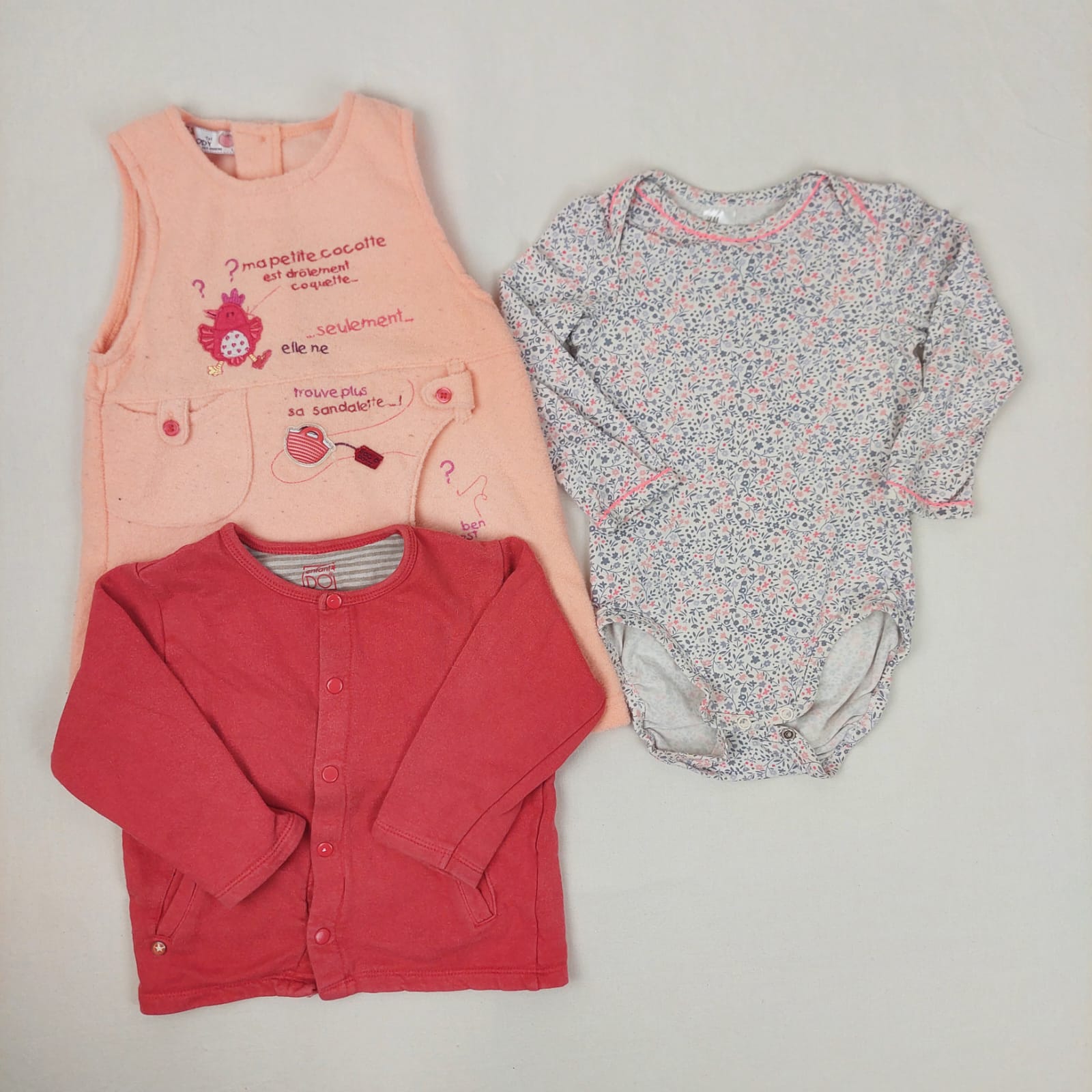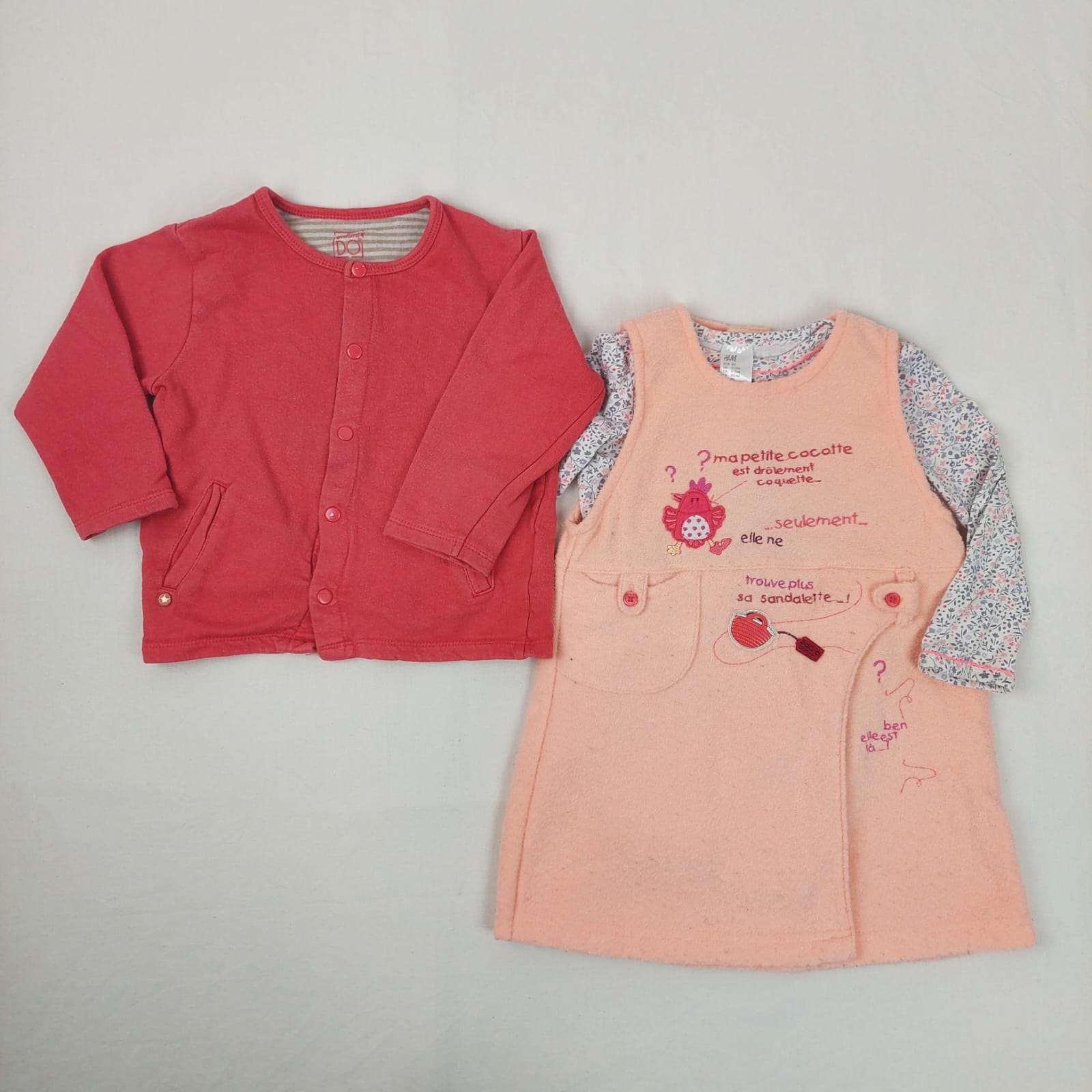 Autres commentaires : Ensembles 3 pièces : 5% elasthanne ,Body maches longues H&M,motif fleurs,100% Polyester, robe droite effet portfeuille Kiss Melody,couleur peche, petit default bouloche d’usage, 100% coton, Gilet rouge