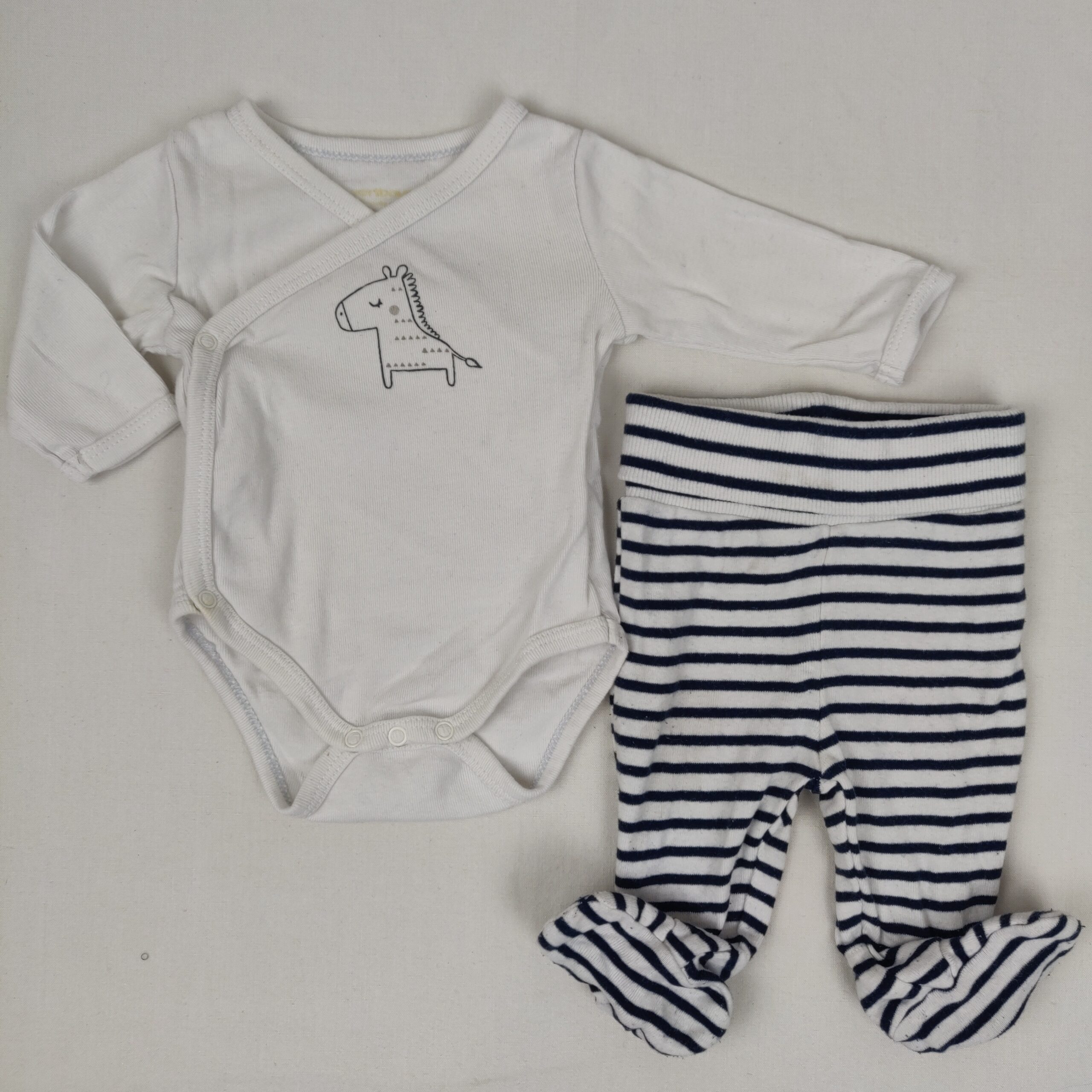 Autres commentaires : Ensemble avec pantalon Kiabi blanc rayé bleu foncé, avec pieds, 100% coton et 1 body blanc croisé, sans marque, avec motif cheval en gris et noir.