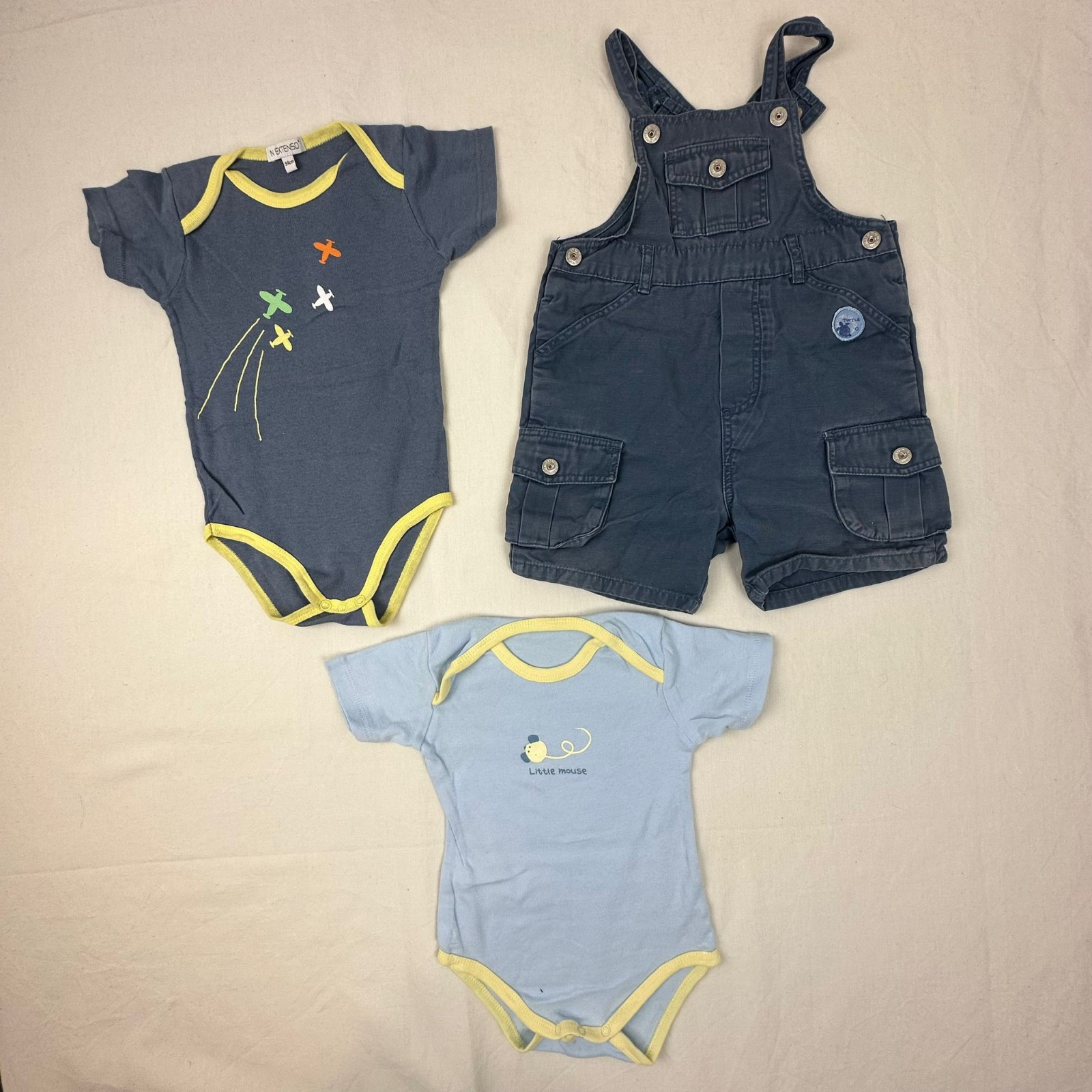 Autres commentaires : Body Carrefour bleu manches courtes. Body In Extenso manches courtes. Salopette courte bleu Bout’chou avec bretelles ajustables.