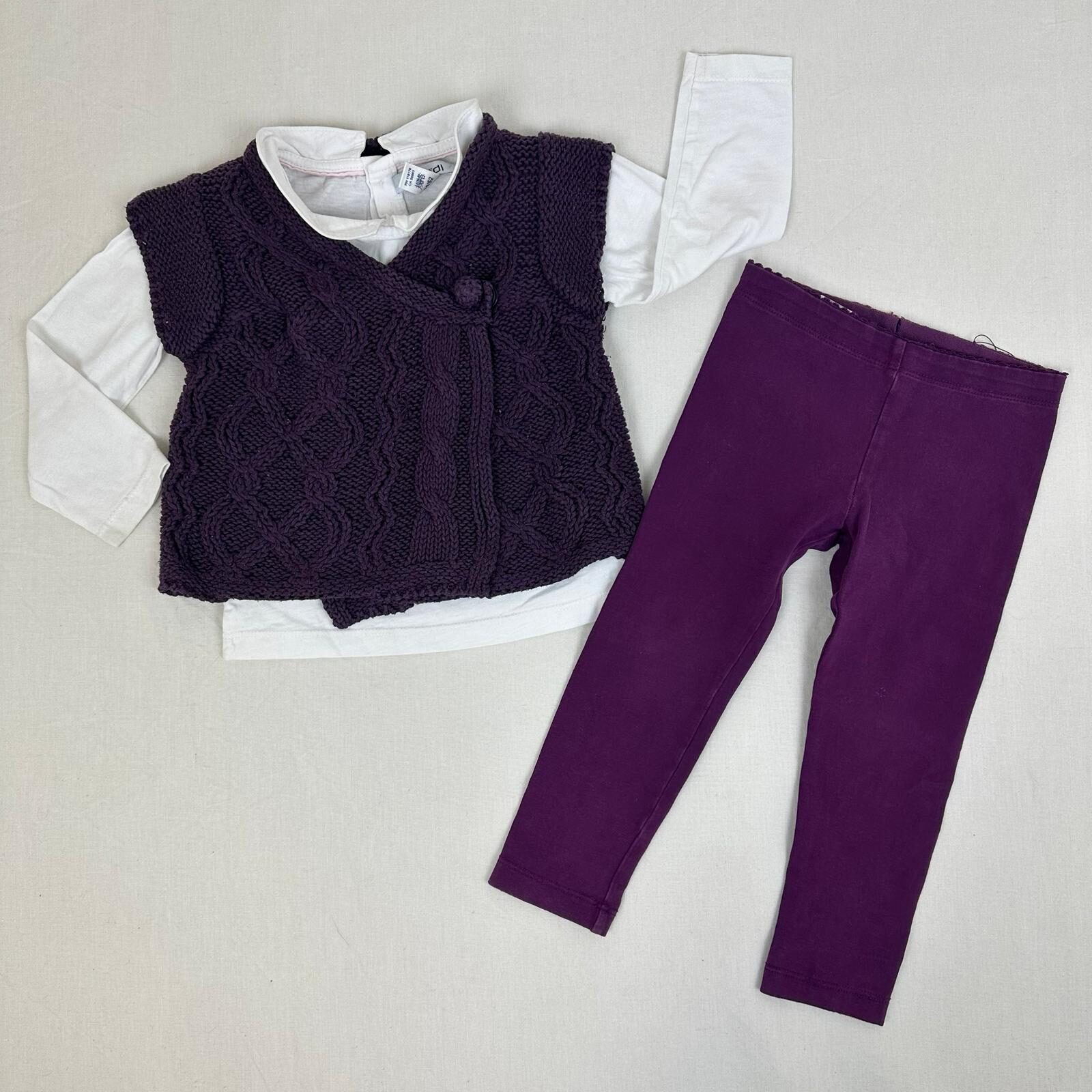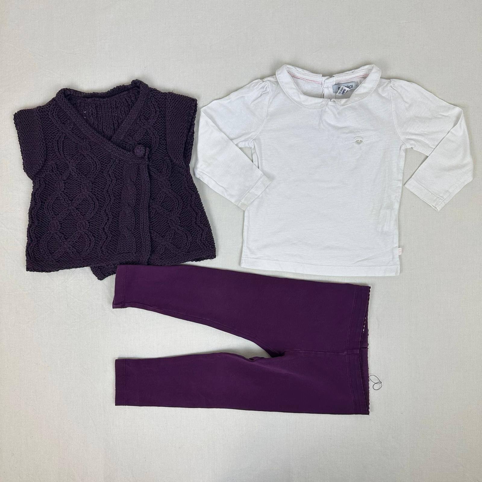Autres commentaires : Coton 100%:t-shirt Okaïdi manches longues blanc, col claudine et une fermeture au dos par 3 boutons. 50% acrylique: gilet cardigan Tape à l’oeil violet, col V avec une fermeture par un bouton pression.8% elasthanne:legging violet Tea Collection avec taille élastiquée.