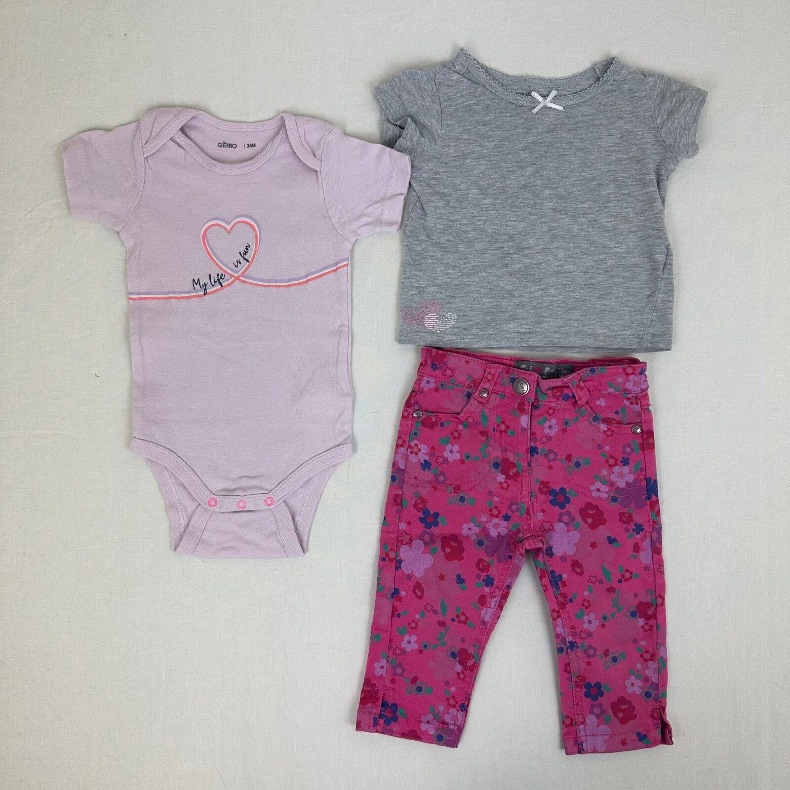 Autres commentaires : 5% viscose. Body violet Gemo manches courtes. T-shirt Verbaudet manches courtes gris. Jean rose Orchestra avec taille élastiquée et ceinturée.