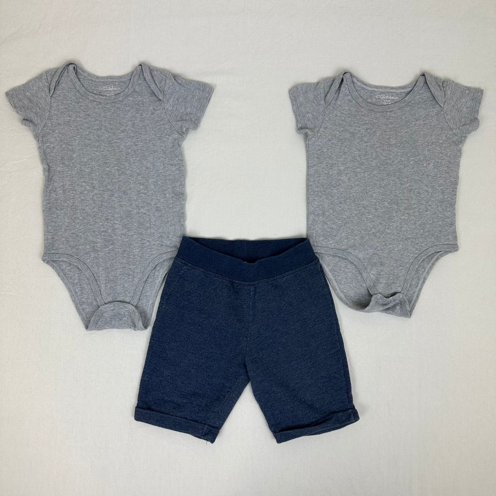 Autres commentaires : 2 bodies Kitchoun gris manches courtes.Petit défaut: une petite tâche sur l’un des bodies. Pantalon Tex bleu foncé avec taille élastiquée.