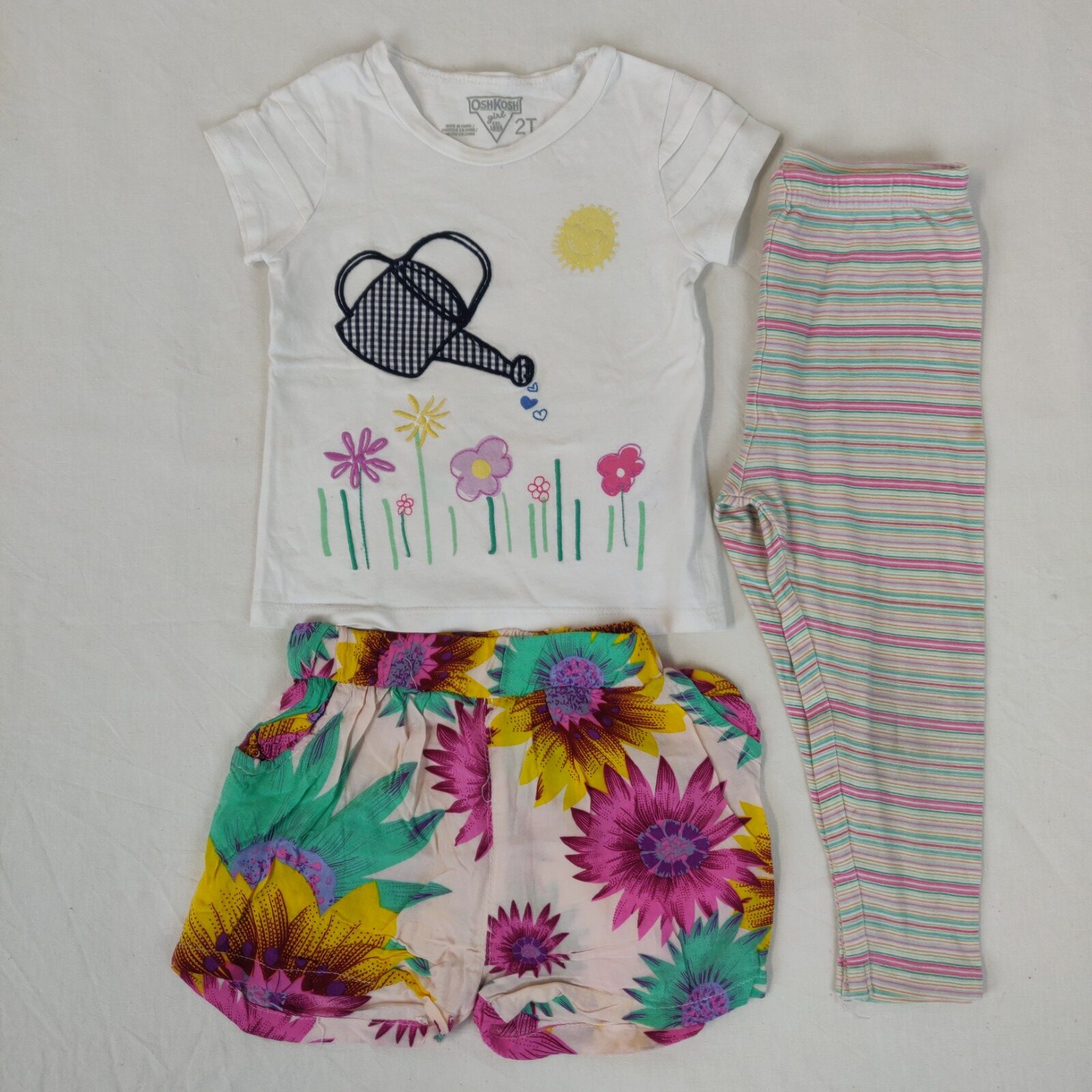Autres commentaires : Ensemble 3 pièces. Un t-shirt à manches courtes Oshkosk – blanc. Motif central piqué multicolore arrosoir arrosant des fleurs. Une tâche très légère marron clair au niveau du côté droit et de la manche gauche. Les manches sont travaillées de manière à constituer des petits volants. Un legging Carter’s rayé multicolore. Taille élastique. Une tâche très légère noire à l’arrière. Un short sans marque fluide – rose clair avec motifs floraux multicolores. Taille élastique. 2 poches latérales. Niveau réduit de fraise à myrtille.