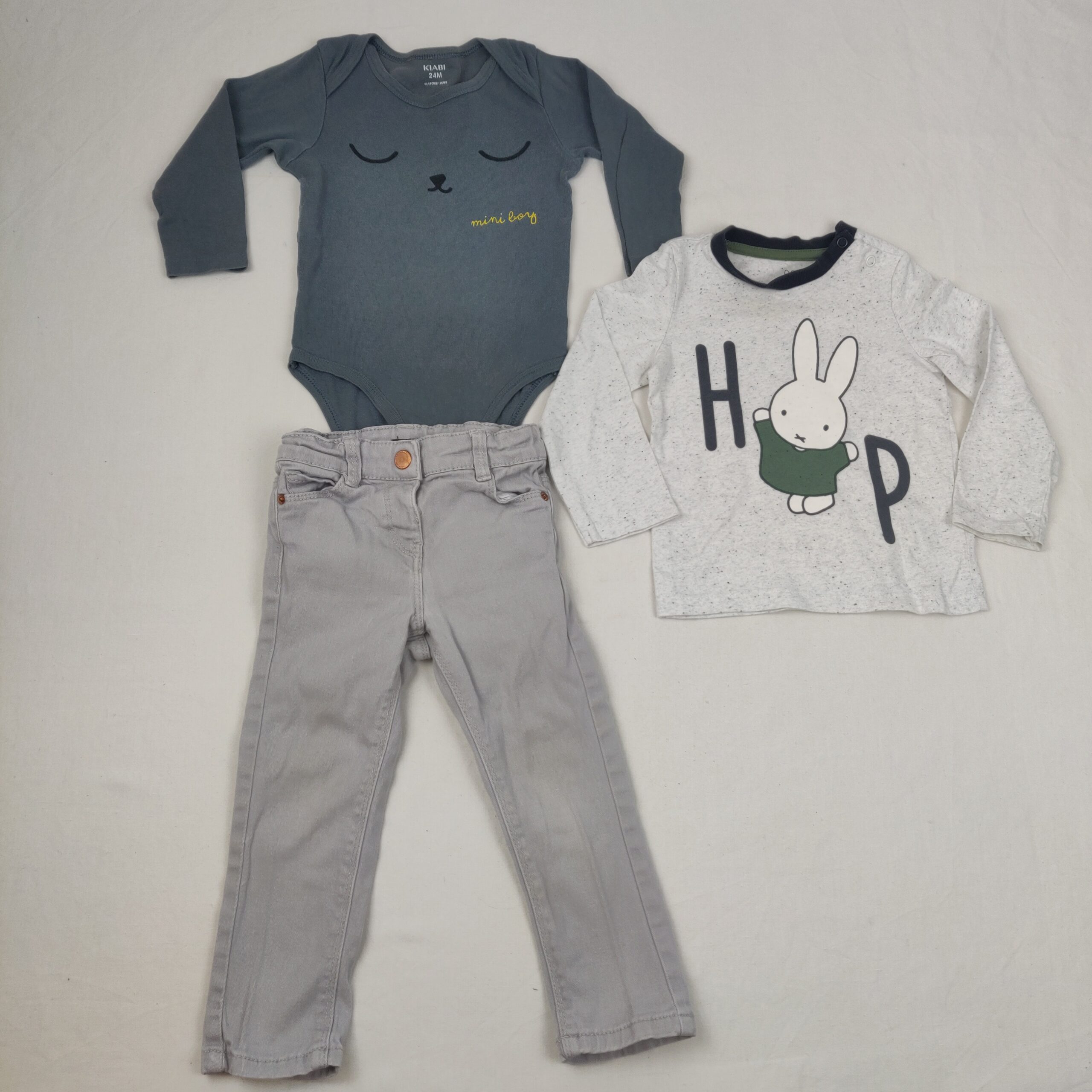 Autres commentaires : 2% élasthanne – Pantalon gris très clair Kiabi, fermeture par bouton pression et taille ajustable – Body Kiabi gris foncé manches longues avec inscription Mini Boy en jaune – T-shirt C&A à manches longues, blanc chiné de gris et de bleu, ouverture par bouton pression sur le côté gauche du col et inscription HOP avec le lapin Ninjntje miffy – 98% coton et 2% polyester.