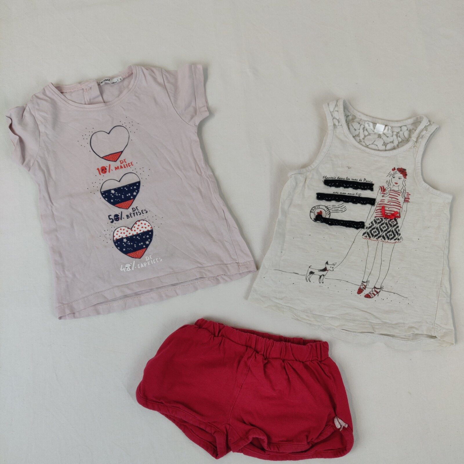 Autres commentaires : Ensemble 3 pièces. Un débardeur Little by Joosa – blanc. Motif central rouge et noir jeune fille promenant un chien accompagné de l’inscription « Flanerie dans les rues de Paris avec mon amie Fifi ». Partie supérieure du dos en dentelle blanche. Short Me to you – rouge. Taille élastique. T-shirt à manches courtes Gemo – rose clair. Motifs centraux 3 coeurs accompagnés de l’inscription « 10% de malice, 50% de bêtises, 40% de caprices ». Ouverture centrale au dos à 2 boutons. Usure normale.