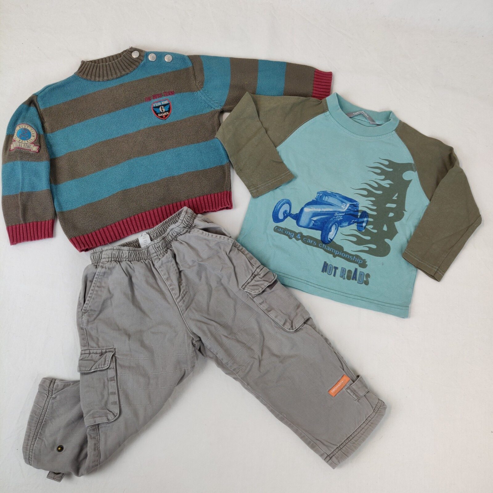 Autres commentaires : Ensemble 3 pièces. Un t-shirt à manches longues Tout compte fait bleu et vert kaki. Motif central voiture ancienne accompagné de l’insription « racing & car championship hot roads ». Une tâche bleu marine près du motif. Un pull La redoute en fines mailles rayé marron et bleu. Inscription centrale « The best team ». Ouverture latérale à 3 pressions. Poignets et taille façon tricot élastique rouge. Usure normale. Un pantalon doublé en polaire Decathlon – taupe. Taille élastique. 2 poches latérales et 2 poches à rabat. Tâches marrons discrètes au devant. Niveau réduit de fraise à myrtille.