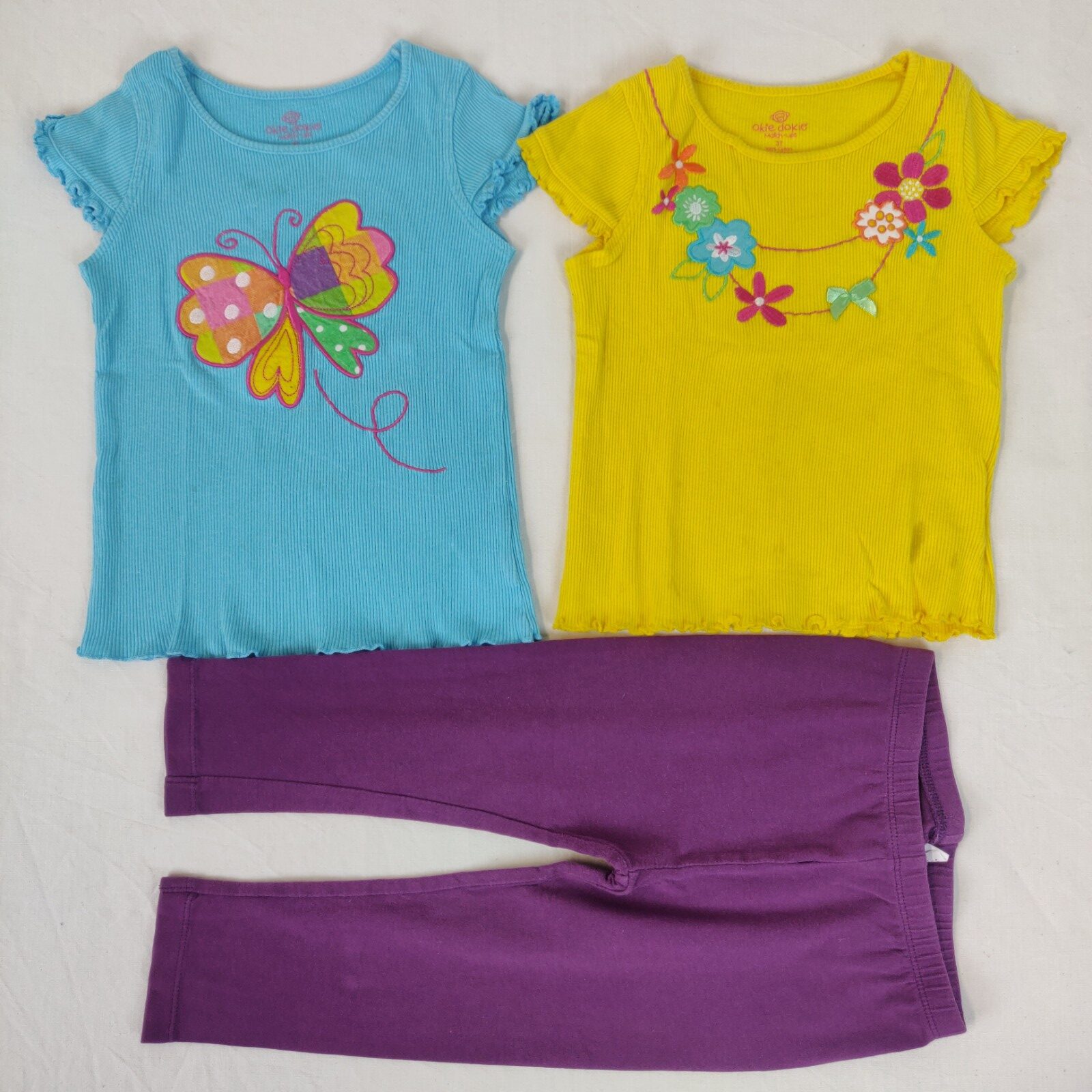 Autres commentaires : Ensemble 3 pièces. 2 T-shirts Okie Dokie à manches courtes à effet froncé. Un t-shirt bleu avec un motif piqué mutlicolore papillon. Quelques tâches marron clair presque imperceptibles sur le devant. Un t-shirt jaune avec motif piqué multicolore collier de fleurs orné d’un noeud satiné vert.Des tâches noires dans le bas du vêtement. Un legging First impressions – violet. Taille élastique. Niveau réduit de fraise à myrtille.