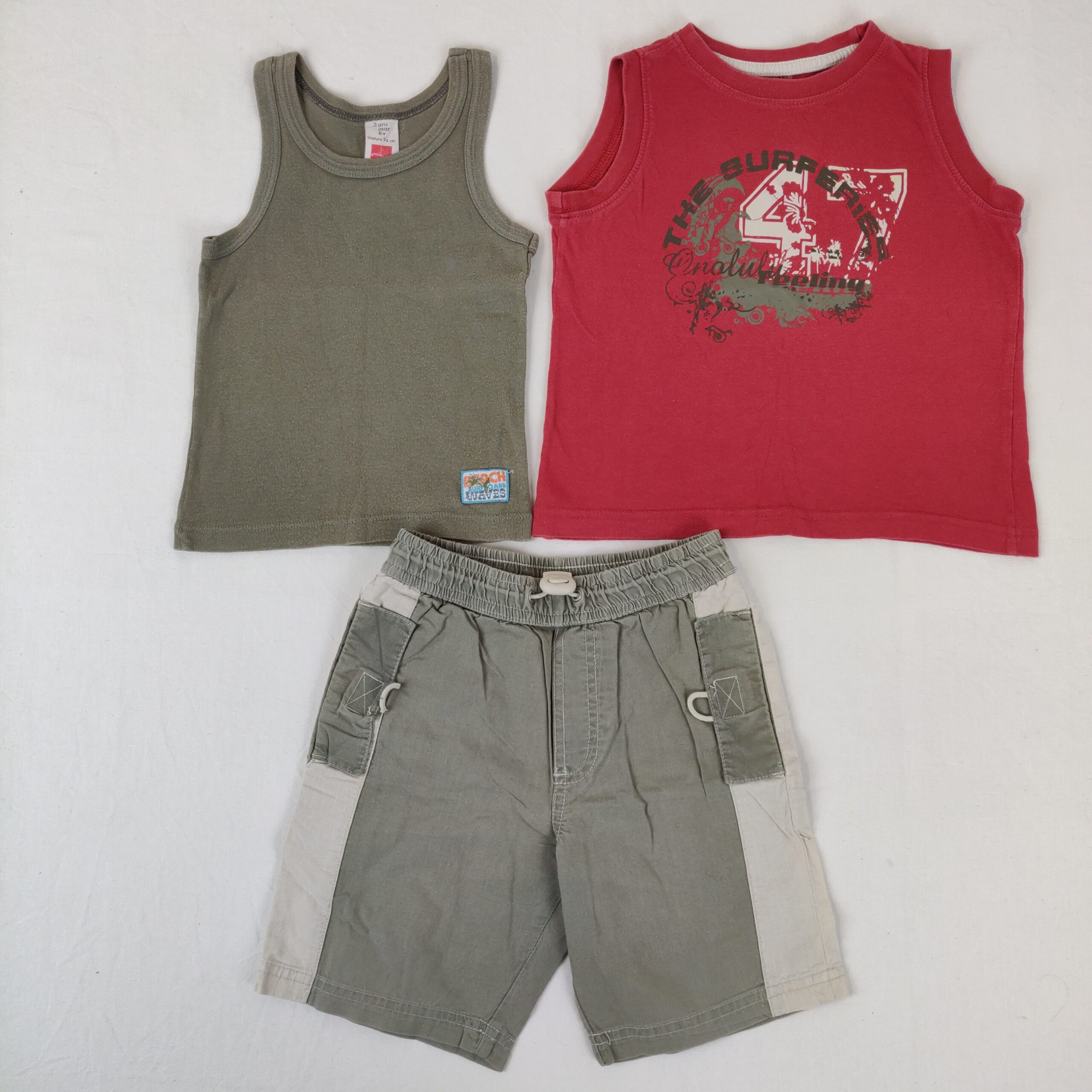 Autres commentaires : Ensemble 3 pièces. Un débardeur In Extenso – rouge. Motif central stylisé accompagné de l’inscription « The surfer 47 ». Un débardeur uni Influx vert kaki. Usure normale. Un bermuda bicolore vert kaki et beige. Taille élastique. 2 poches latérales à rabat.