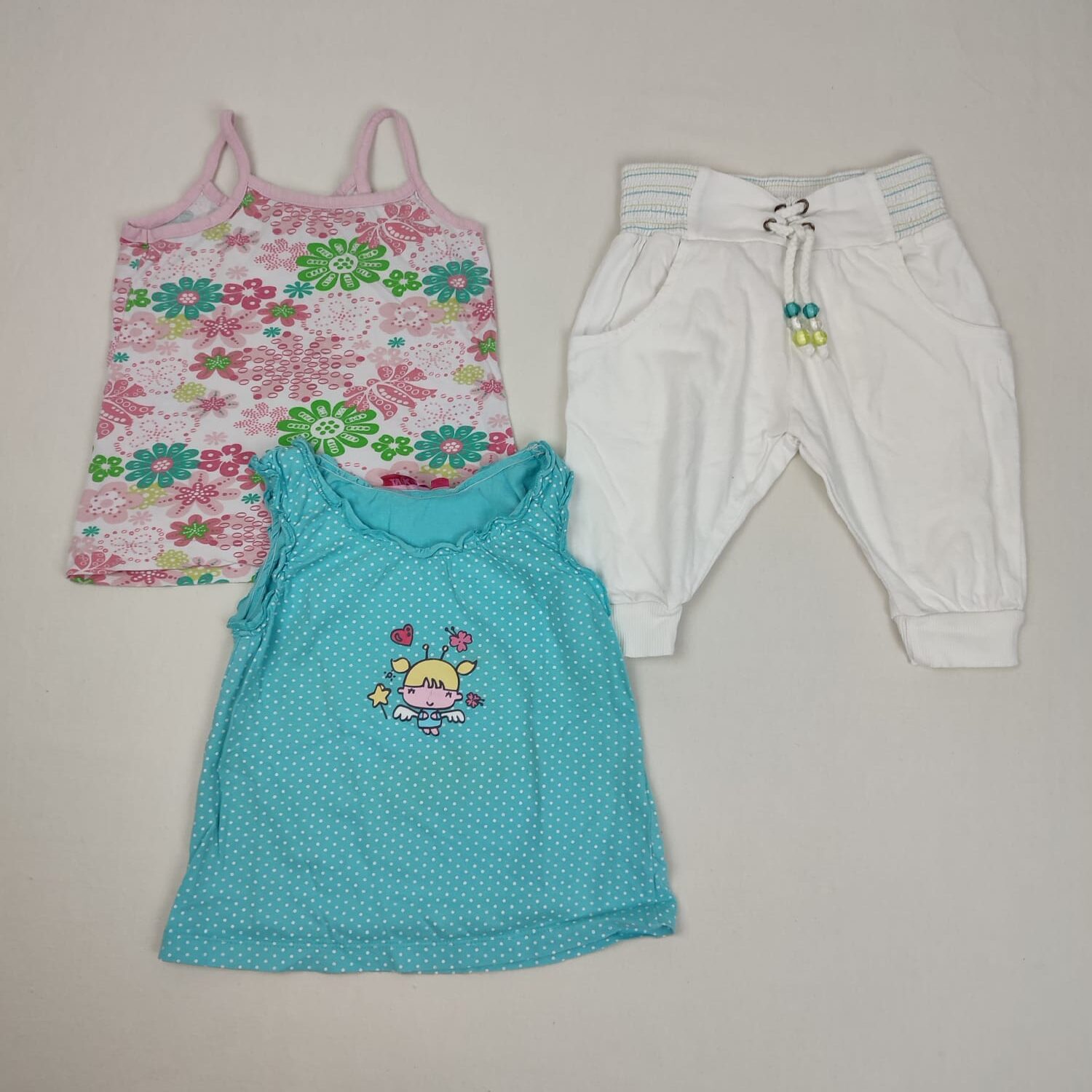 Autres commentaires : Ensemble 3 pièces dont 1 pantalon blanc In Extenso, en jersey de coton léger, style légèrement sarrouel, chevilles et taille élastiquées, cordons blancs lacés devant, avec perles bleues, vertes et transparentes au bout, poches latérales, 1 t-shirt sans manches NKY, bleu-vert à mini pois blancs, en jersey 100% coton, motif central devant d’ un ange blond à couettes avec baguette étoile, fleurs et coeur, aux encolure et emmanchures dotées d’un liseré élastiqué et volanté et 1 t-shirt Eldys à bretelles fines, rose à fleurs vertes, jaunes et roses, en jersey 100% coton.