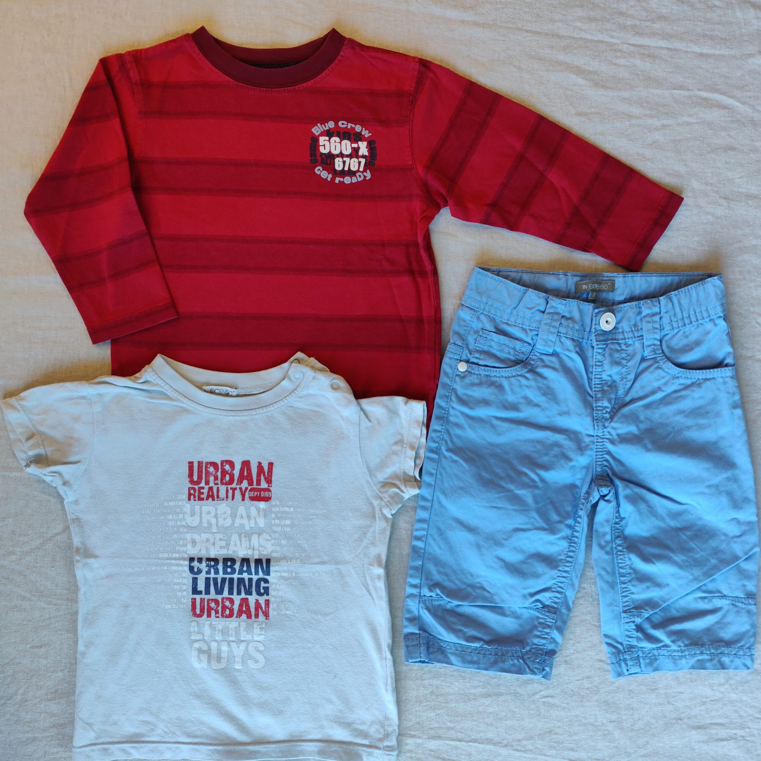 Autres commentaires : 1 T-shirt manches courtes In Extenso boutonné par deux pressions à l’épaule gauche, inscriptions rouges, bleus et blanches « Urban Reality », 1 t-shirt manches longues School Moove rouge-bordeaux « bleu Crew » et un bermuda bleu ciel In extenso, boutons blancs, ceinture ajustable, pinces aux genoux.