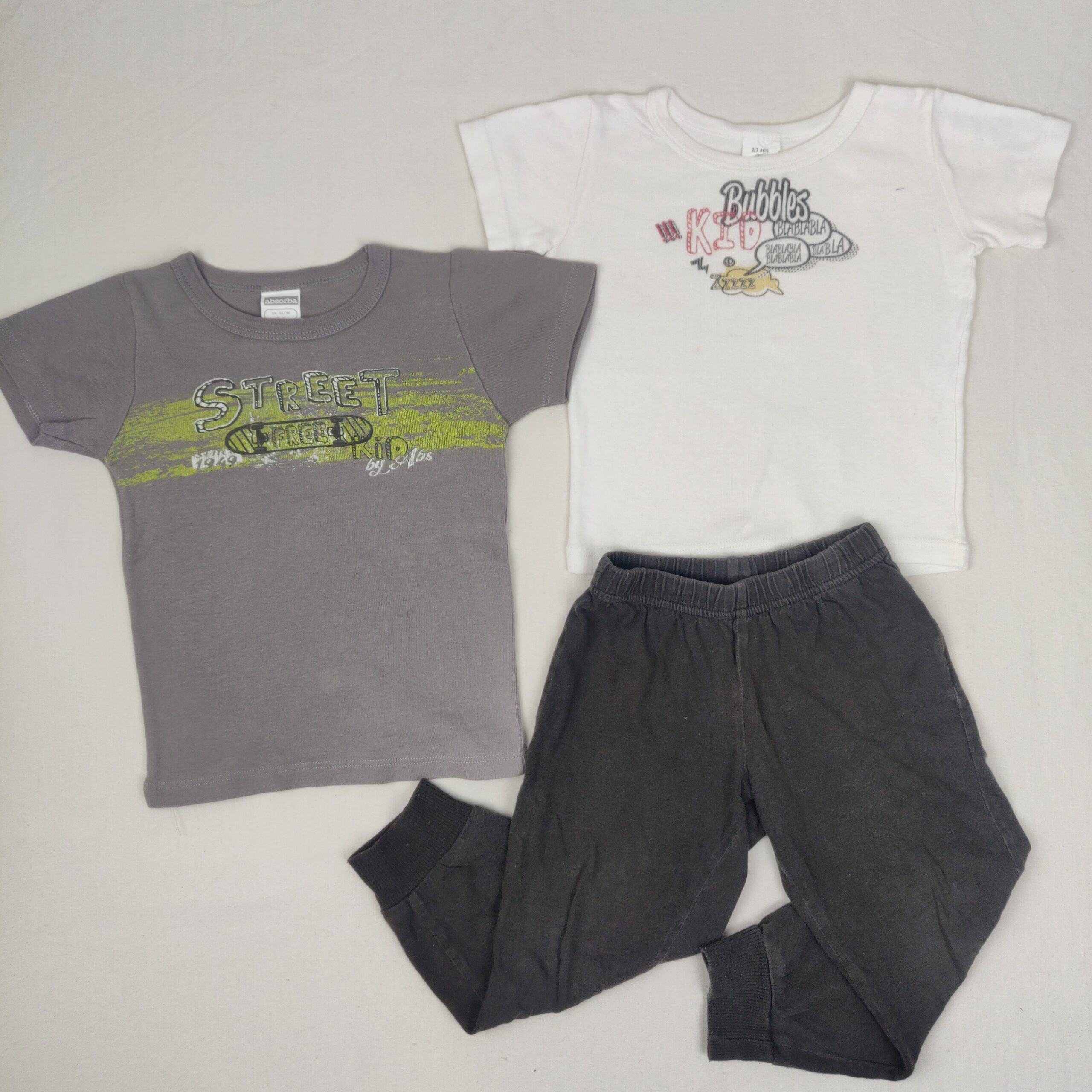 Autres commentaires : Ensemble 3 pièces dont – 1 T-shirt Absorba gris taupe à manches courtes, col rond, 100% coton, motif skateboard et inscription Street Free – 1 T-shirt In Extenso blanc écru à manches courtes, col rond, 100% coton, motif Bulles de BD noir indiquant Blablabla et inscription Bubbles Kid en rouge et noir – 1 pantalon sportswear Kiabi marron foncé, taille et bas élastiqués, (couleur un peu passée au niveau de la taille).