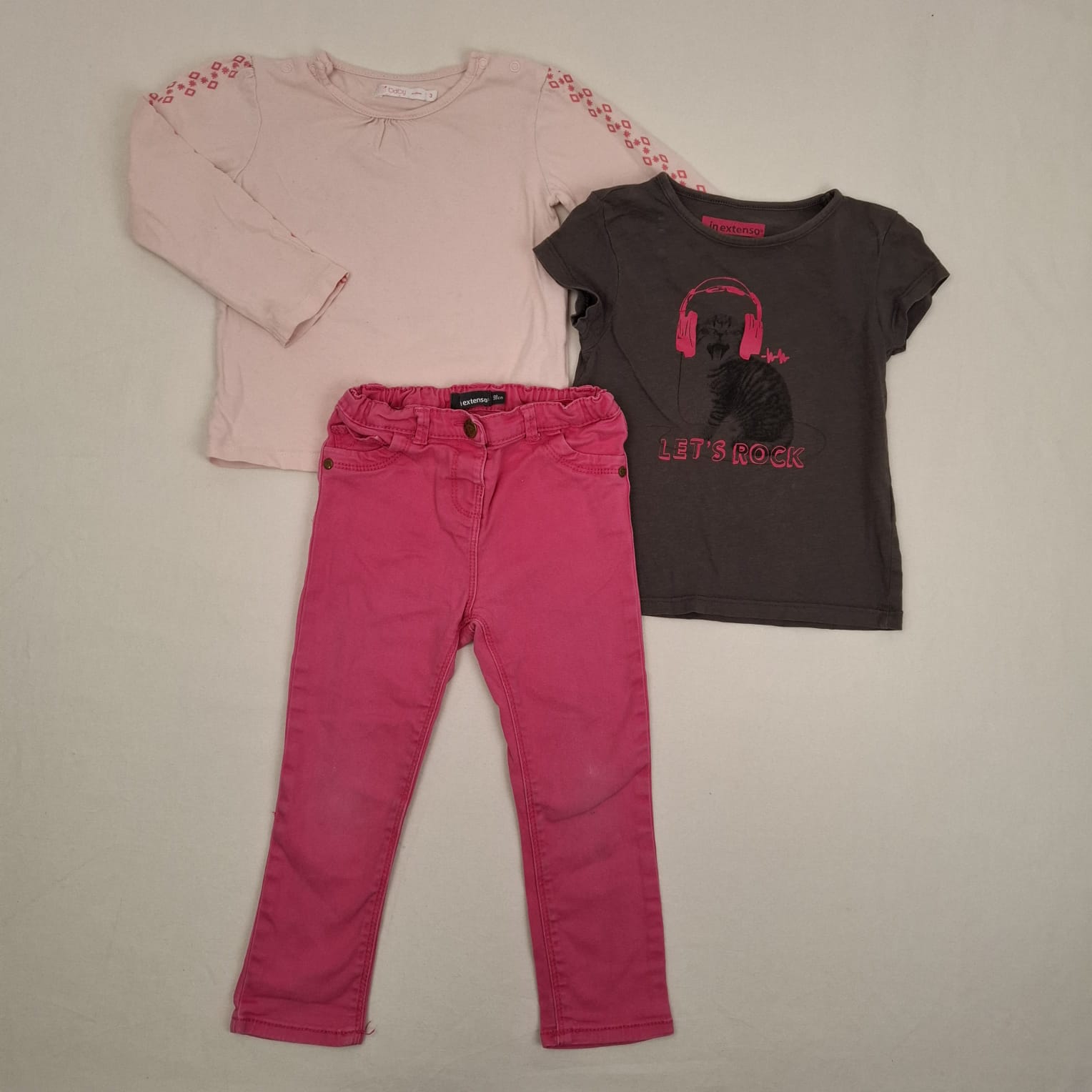 Autres commentaires : Ensemble 3 pièces : – Pantalon rose fuchsia, fermeture devant par un bouton pression, taille ajustable par élastique intérieur, 98% coton et 2% élasthanne. Une petite trace d’usure en bas. Niveau réduit de l’ensemble de Fraise à Myrtille. – T-shirt manches courtes In Extenso gris marron, devant motif chat ton sur ton avec casque de musique rose et inscription « Let’s rock », 100% coton. – T-shirt manches longues rose pâle Gémo, fermeture aux épaules par boutons pression, frise étoiles et losanges rose scintillant sur chaque manche, 100% coton.