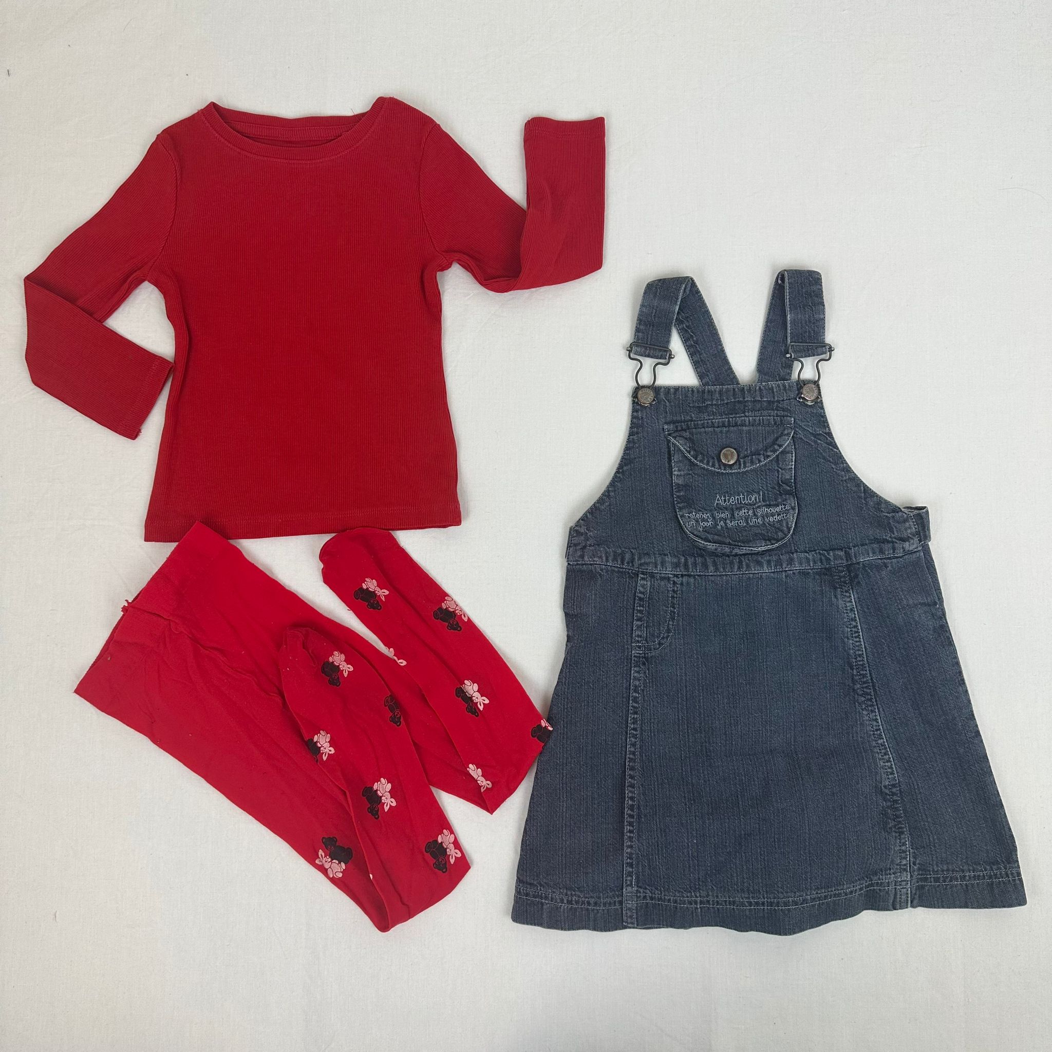 Autres commentaires : Salopette robe Petit Boy bleu foncé. T-shirt rouge Next manches longues. Collant rouge sans marque avec motif des nounours.