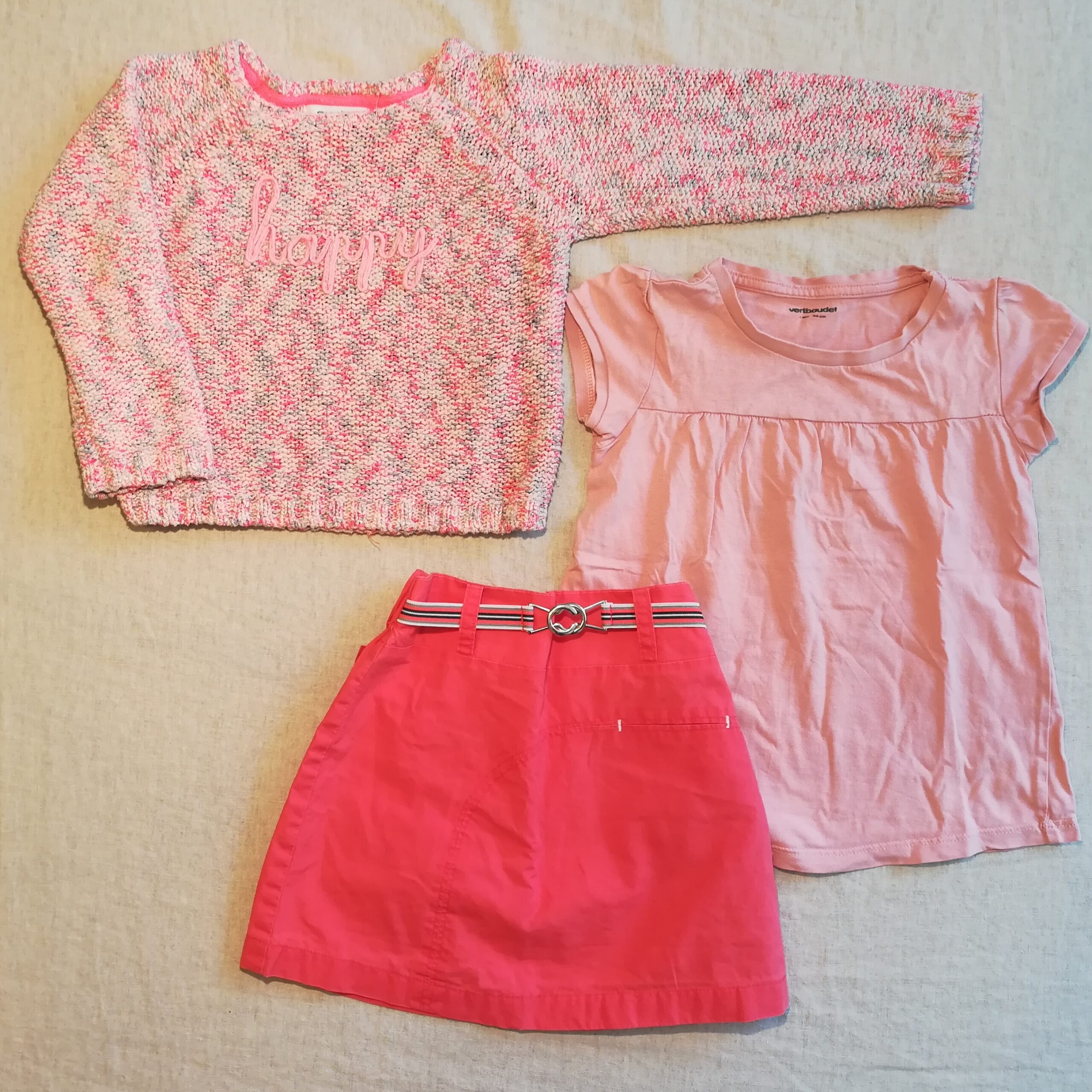 Autres commentaires : Pull fils d’argent Okaïdi bon état, t-shirt rose Verbaudet et jupe orange Elle parfait état