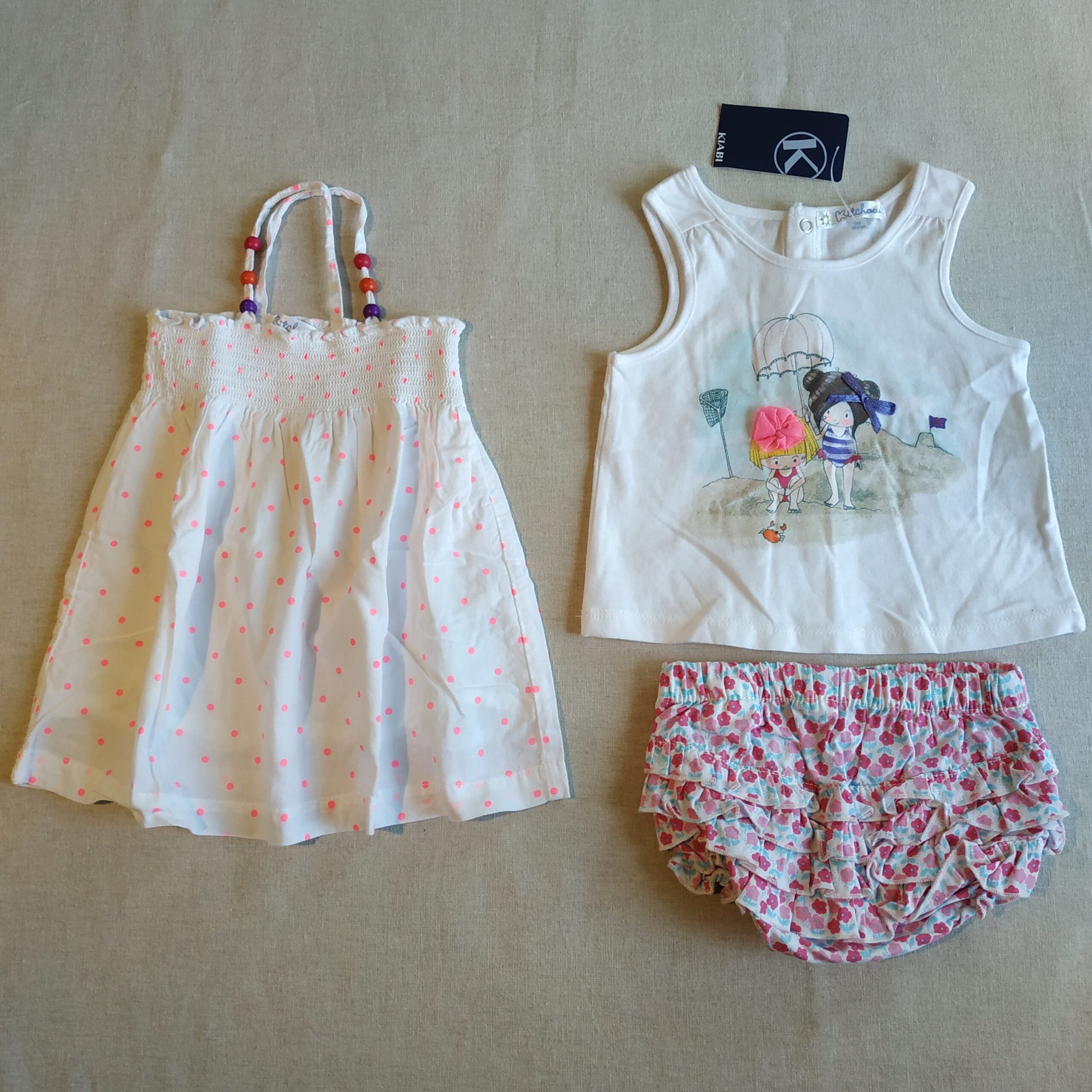 Autres commentaires : Robe blanche à bretelles Kiabi, motif à pois rose fluo, haut à smock, perles (rouges violettes et orange) sur les bretelles. T-shirt blanc sans manches Kiabi neuf avec étiquète , thème plage avec deux petites filles sur le sable , petits noeuds en tulle rose et en ruban violet cousus sur les personnages , dos s’ouvrant entièreemnt par 5 boutons pression. Culotte H&M à petites fleurs roses et bleues, froufrous sur les côtés et l’arrière.