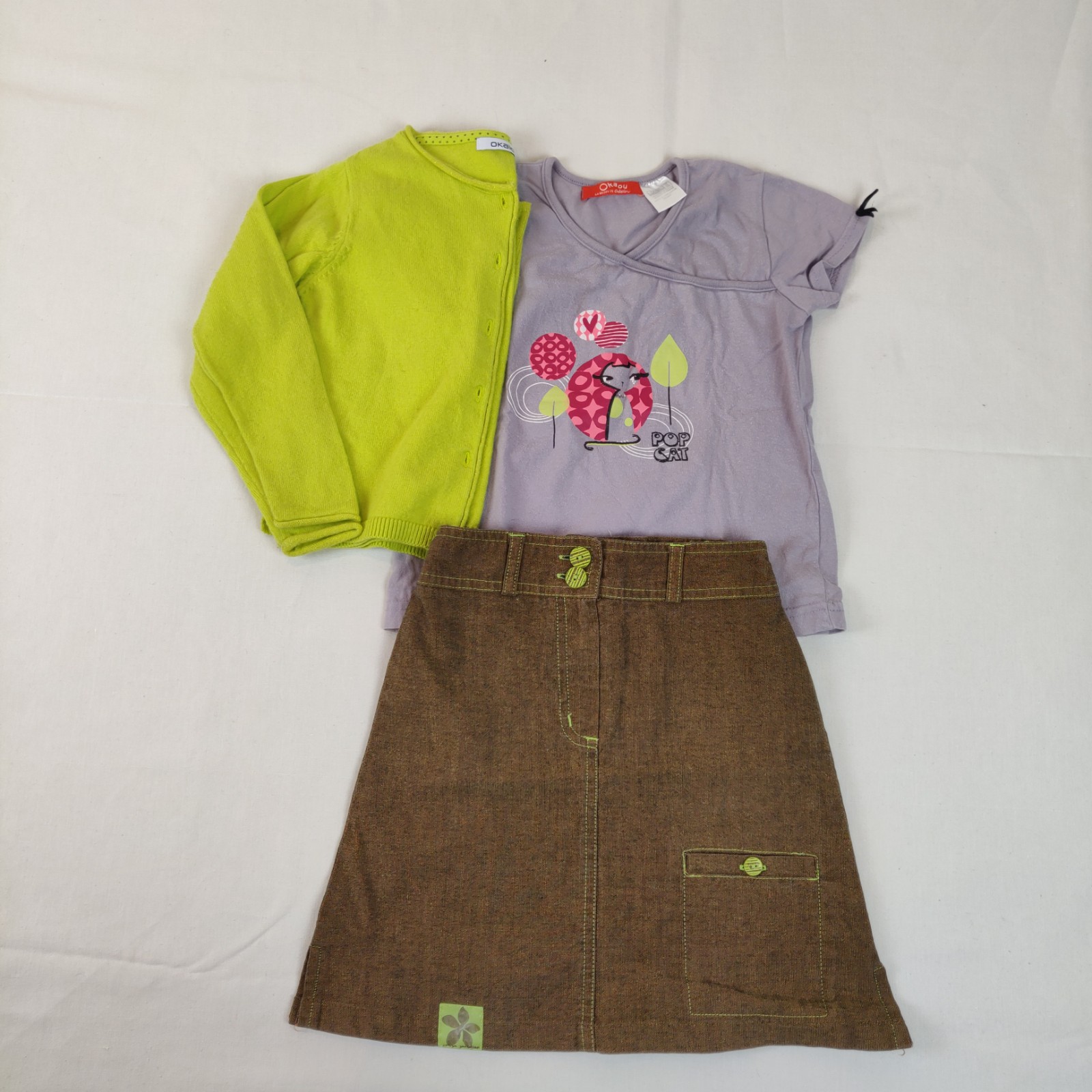 Autres commentaires : 40% polyamide. Gilet Okaïdi (100% coton) – jaune-vert vif avec liseré de fils métalliques aux col et manches. Ouverture centrale à partir du col à boutons classiques nacrés. Jupe Orchestra (11% polyester) – marron avec détails jaune-vert (coutures, boutons et écusson) – taille ajustable. Ouverture centrale à fermeture éclair et 2 boutons classiques. 1 poche latérale et 1 poche arrière. Passants pour une ceinture. T-shirt manches courtes La Redoute – marron glacé et motif central chat avec rappel de couleur jaune-vert. Léger effet pelucheux.