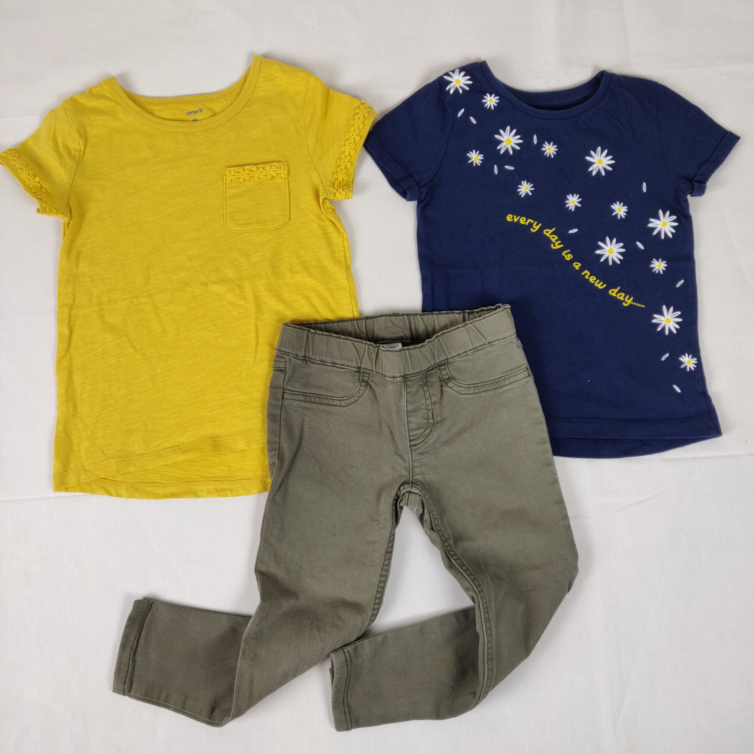 Autres commentaires : Pantalon kaki Carter’s taille élastiquée 41% viscose, 1% élastanne. T-shirt Carter’s à manches courtes jaune avec dentelles en relief sur manches et poche devant et t-shirt manches courtes Dunnes Stores bleu avec des marguerites blanches et jaunes et une inscription en jaune  » every day is a new day…  »