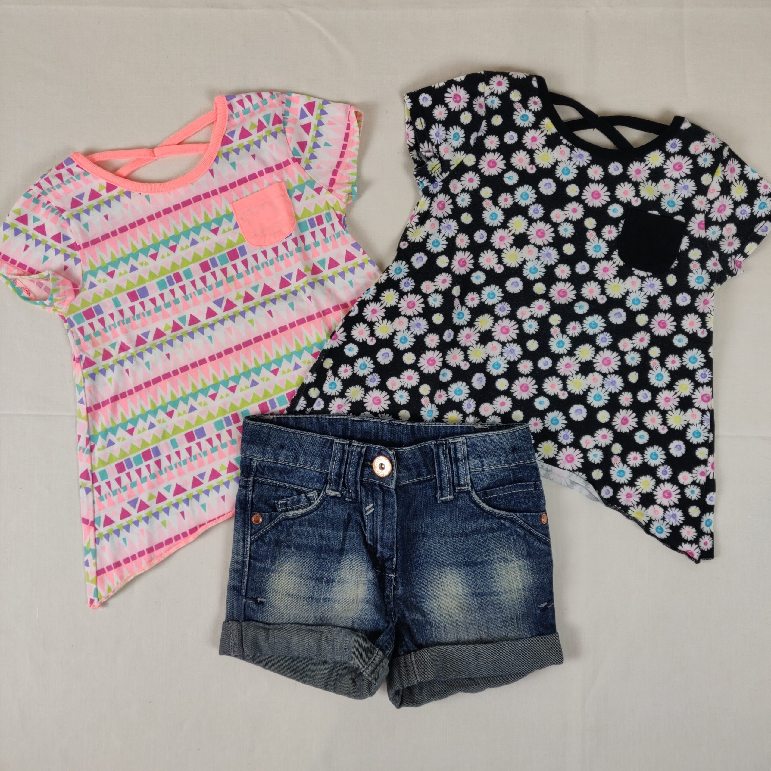 Autres commentaires : 40% polyester – 2 T-shirts manches courtes, avec lanières en haut du dos et mini poche poitrine, de la marque Garanimals, un fond noir avec motif marguerites colorées et un fond blanc avec motif triangles colorées fluorescents – 100% coton – Short en jeans de la marque Next avec revers, taille élastique intérieur réglable, bouton metal classique et fermeture éclair;