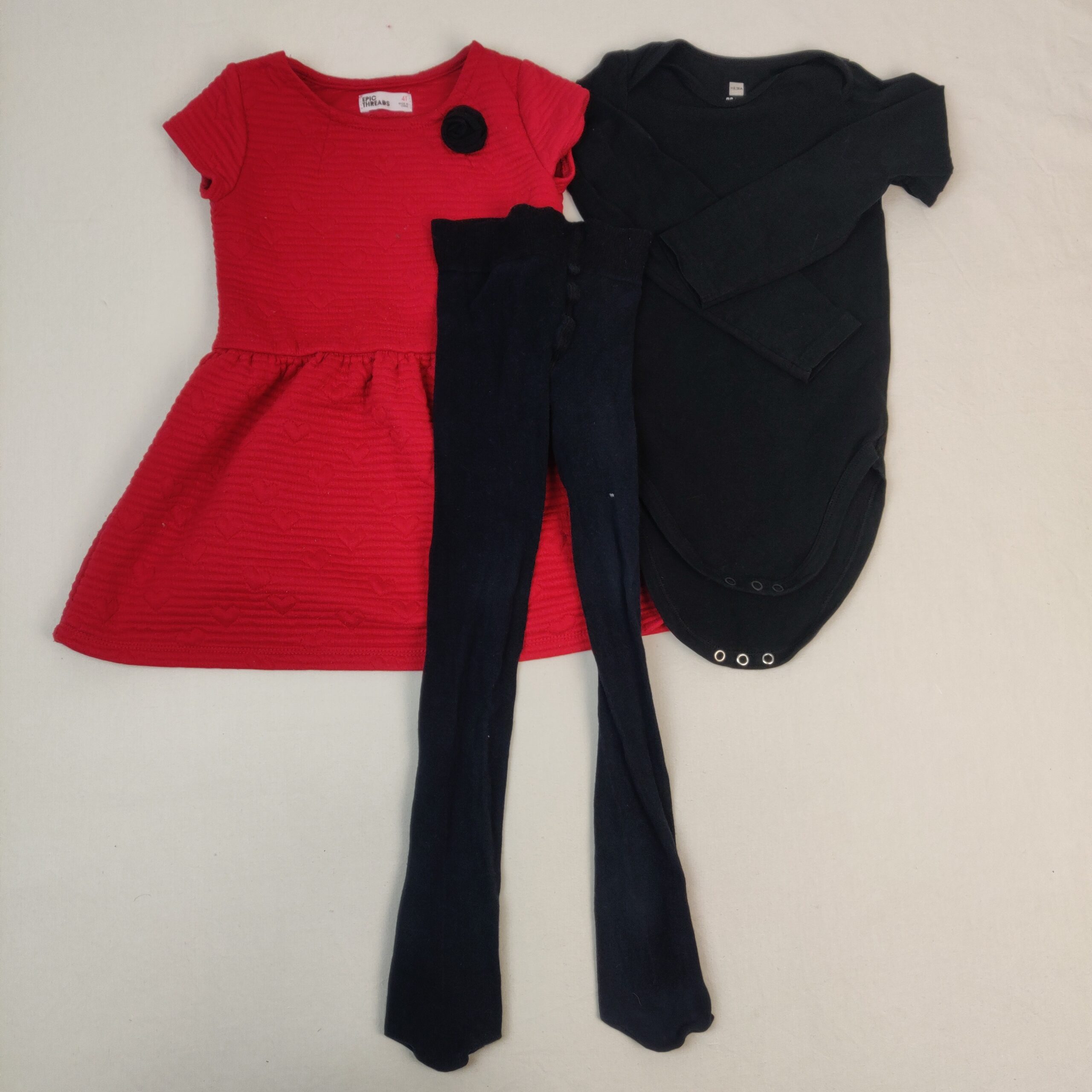 Autres commentaires : Ensemble 3 pièces dont – 1 robe rouge à manches courtes Epic Threads, 85% polyester, 12% rayonne et 3% élasthanne froncée à la taille et forme évasée, col rond, petite rose noire à gauche du col, – 1 body Hema uni noir à manches longues , 95% coton et 5% élasthanne – 1 paire de collants noirs chauds H&M, taille 2-4 ans, 80% coton, 12% élasthannne et 8 % polyamide.