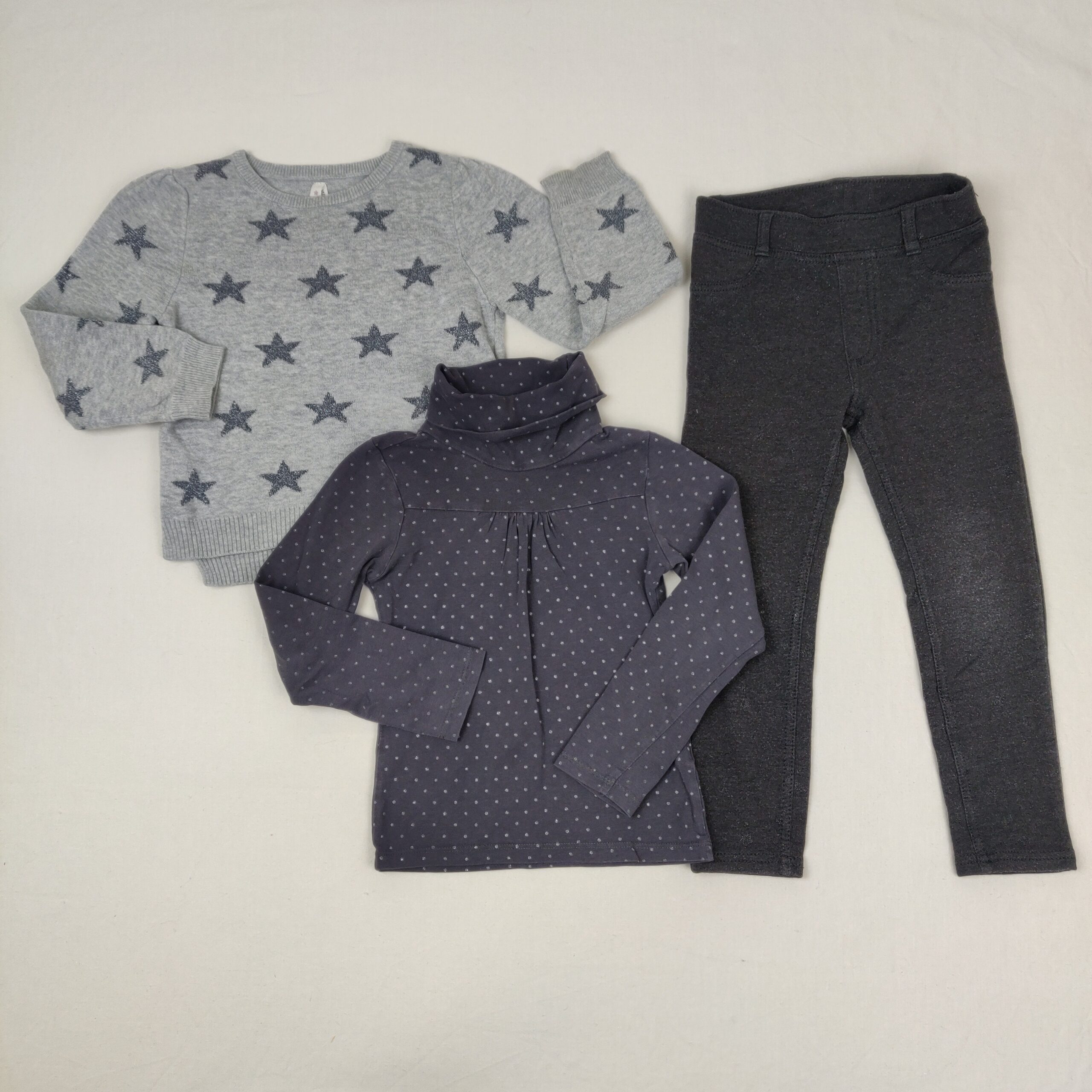 Autres commentaires : Ensemble 3 pièces : – Pull gris Young dimension motif étoiles gris foncé, petite tache, 10% polyester, 5% fibre. – T-shirt manches longues gris à pois argentés Okaidi, col roulé, minuscule tache, 5% élasthanne. – Pantalon slim gris foncé H&M, 37% polyester, 5% élasthanne. – Niveau baissé de Fraise à Myrtille.