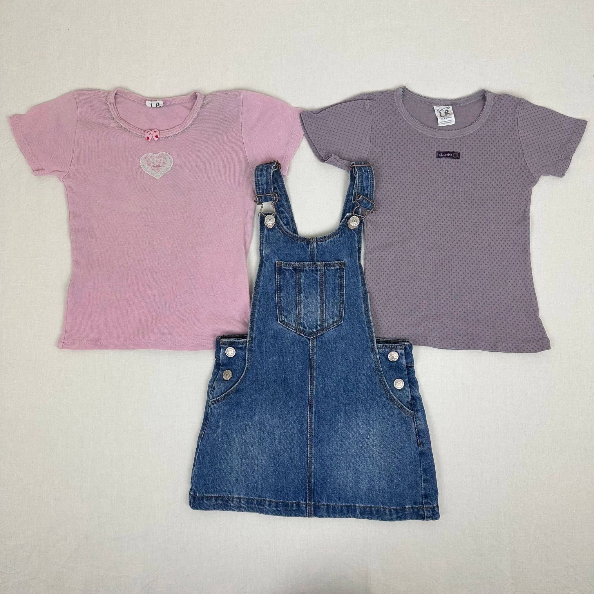 Autres commentaires : Salopette Kiabi jupe en jean bleu avec manches en bretelles ajustable. 2 t-shirt manches courtes Absorba rose.