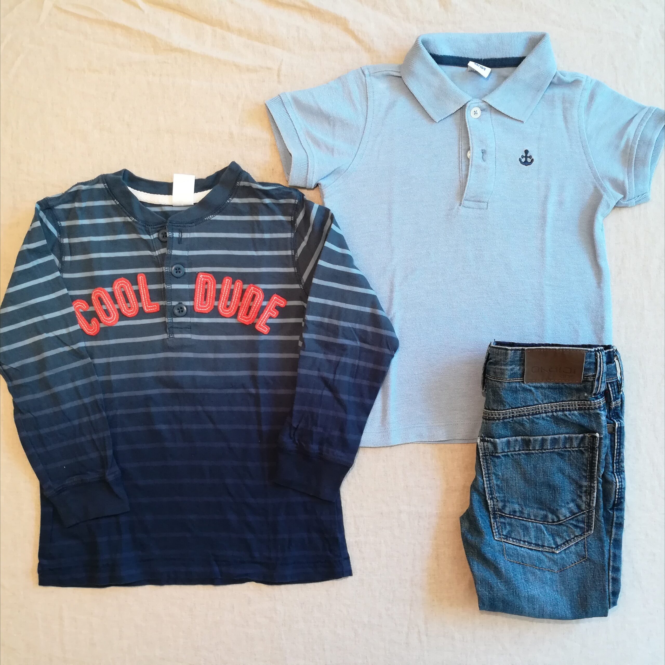 Autres commentaires : 1 t-shirt manches longues parfait état Carter’s ‘cool dude’, 1 polo manches courtes polyester assez bouloché et un jean Okaïdi slim non valorisé (genoux usés)