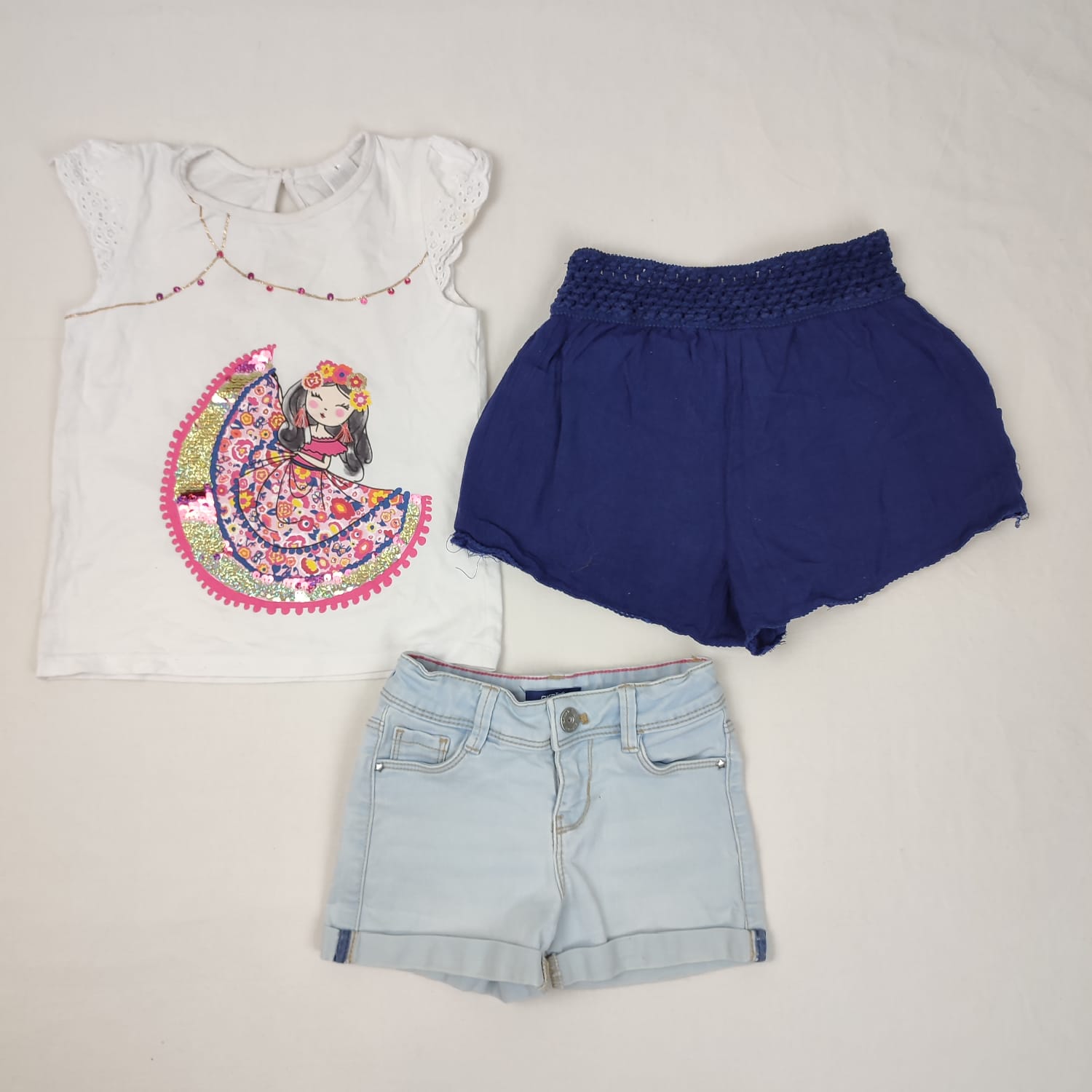 Autres commentaires : Lot de 3 pièces: Short Jean Okaïdi bleu clair, fermeture par bouton pression et zip, 32% polyester , 2% elasthanne. Short bleu foncé lefties, large ceinture élastique, 100% viscose, doublure 100% coton. T-shirt Palomino blanc avec manches en dentelle à motif filles et des paillettes, 100% coton.
