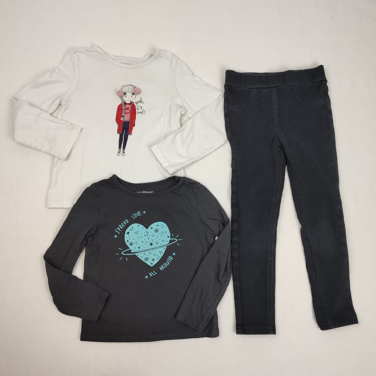 Autres commentaires : Ensemble 3 pièces dont un pantalon de type jeggings noir de La Halle aux vêtements, taille élastiquée, fausses poches avant et vraies poches arrière, 58% coton, 32% polyester et 10% élasthanne ainsi qu’un lot de 2 t-shirts manches longues In Extenso, col arrondi, en jersey 100% coton dont un blanc au motif central fillette en rouge et jeans bleu avec pompons roses en relief dans les cheveux avec inscription « Yeah it’s cool! » et un gris foncé au motif central coeur vert d’eau ceinturé de l’inscription « Spread love all around ».