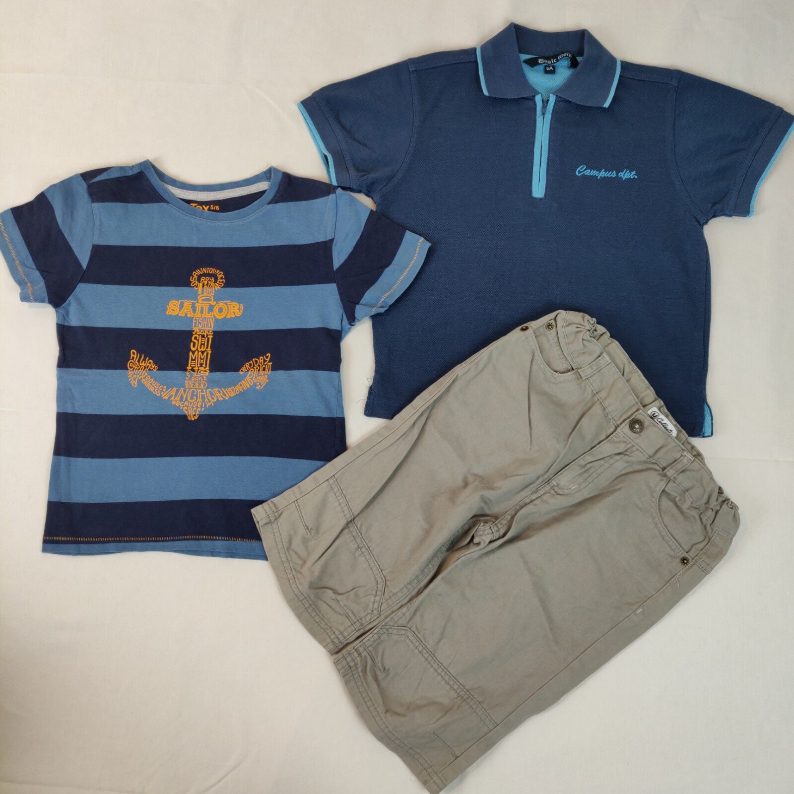 Autres commentaires : Bermuda de marque « U Collection »- beige – ouverture centrale à fermeture éclair et bouton classique. 2 poches latérales et 2 poches arrières. Passants pour une ceinture. Polo de marque « Basic One » à manches courtes (polyester majoritaire et 35% coton) – bleu-gris ouverture centrale à partir du col à fermeture éclair. Liserés bleu clair au col et aux manches. T-shirt de marque Tex à manches courtes rayé bleu et bleu foncé avec motif orange ancre marine. Usure normale des vêtements.