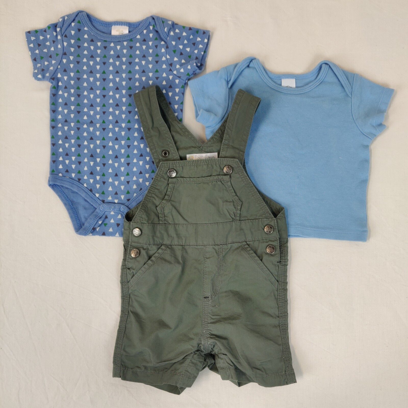 Autres commentaires : Ensemble 3 pièces. Une salopette courte Kitchoun – vert. Attaches des bretelles à pressions réglables. Une pochette centrale. Ouverture latérale à 2 pressions. Ouverture à l’entrejambe à pressions. Un t-shirt à manches courtes C&A – bleu. Un body à manches courtes Chick pea – bleu à motifs triangles blancs, noirs et verts.