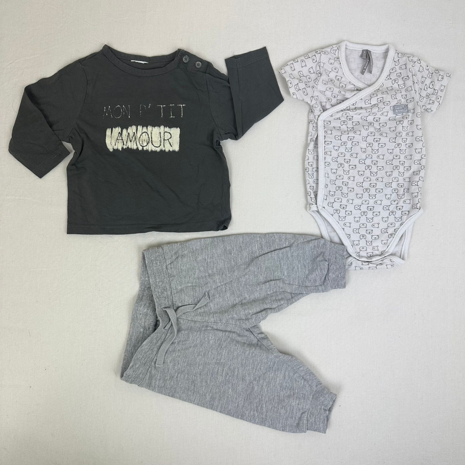 Autres commentaires : 5% elasthanne.Body blanc manches courtes orchestra avec une fermeture par boutons pressions.T-shirt manches longues gris sans marque avec une fermeture par boutons au niveau de l’épaule. Pantalon jogging H&M avec taille élastiquée.