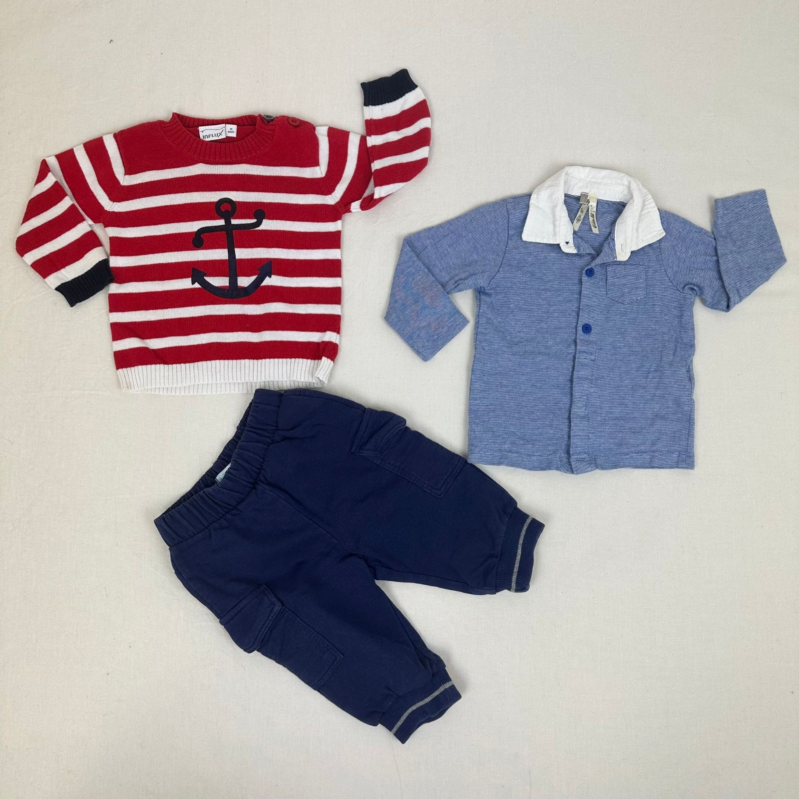 Autres commentaires : Pantalon jogging bleu de U avec taille élastiquée. Pull manches longues Influx rouge avec rayures blanches. Polo Orchestra manches longues avec une fermeture par boutons devant.