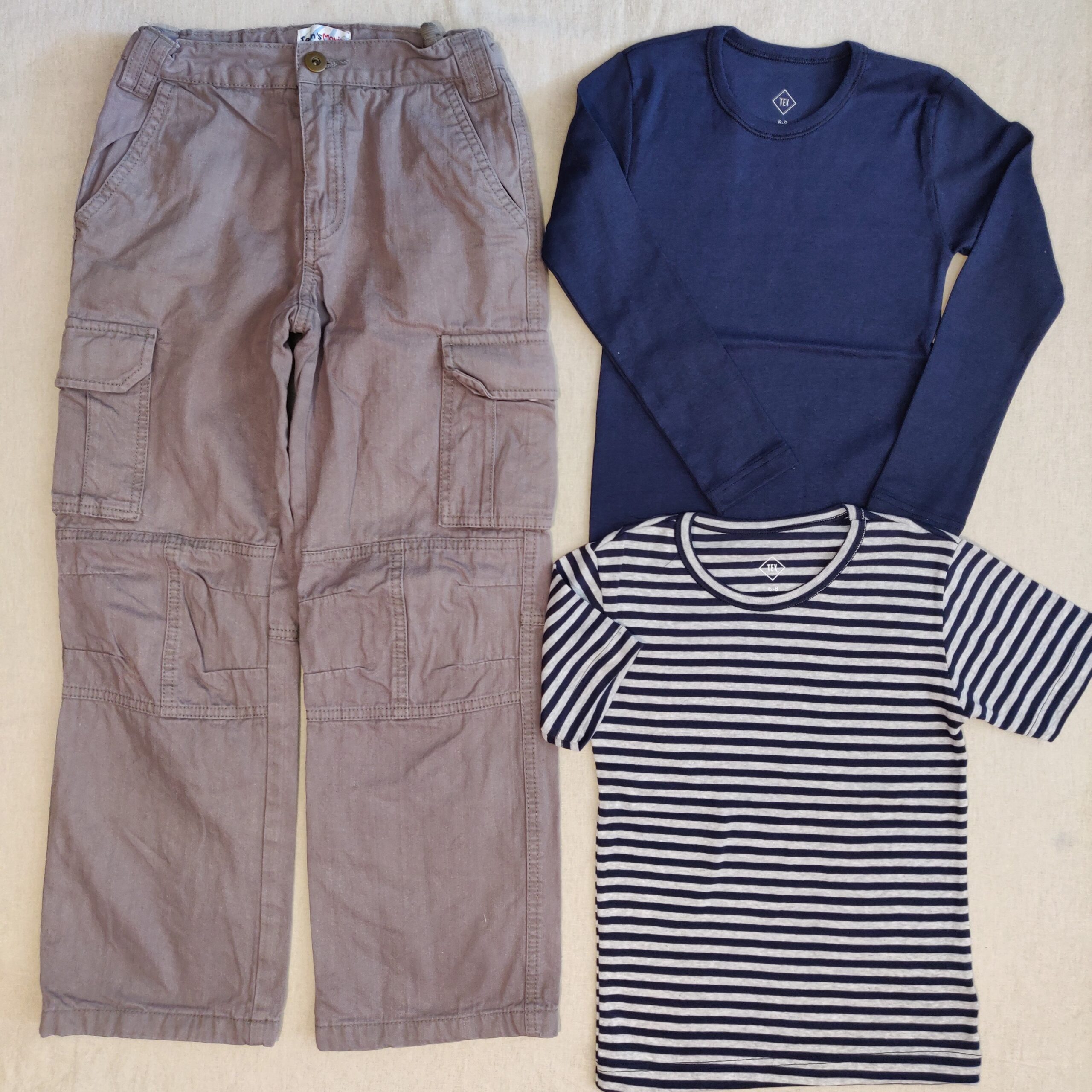 Autres commentaires : Pantalon Teen’s Moving gris doublé en jersey de coton, taille ajustable, 6 poches dont deux latérales plaquées à soufflet. 2 t-shirts Tex état neuf, un bleu marine uni manches longues et un manches courtes bleu marine et gris à rayures.