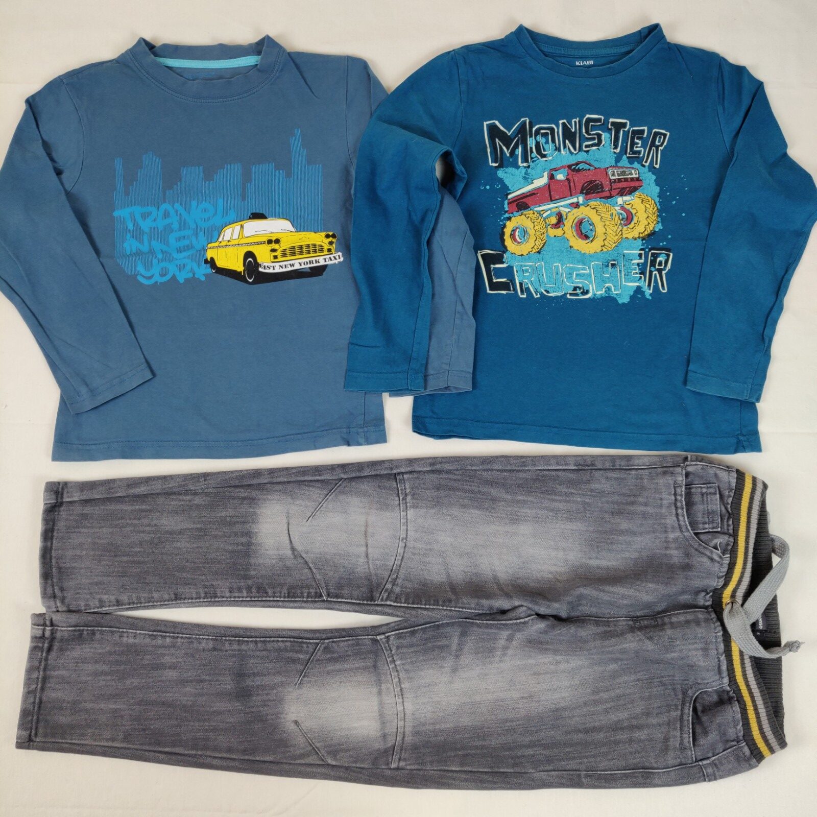 Autres commentaires : Ensemble 3 pièces. T-shirt à manches longues Kiabi bleu avec motif central Monster Truck et inscription « Monster Frusher ». T-shirt à manches longues In Extenso bleu-gris avec motif jaune taxi new yorkais et inscription « Travel in New York ». Jean noir In Extenso. Taille façon tricot élastique gris avec 2 bandes jaune et gris clair. 2 poches latérales et 2 poches arrières. Traces d’usure sur les jambes.