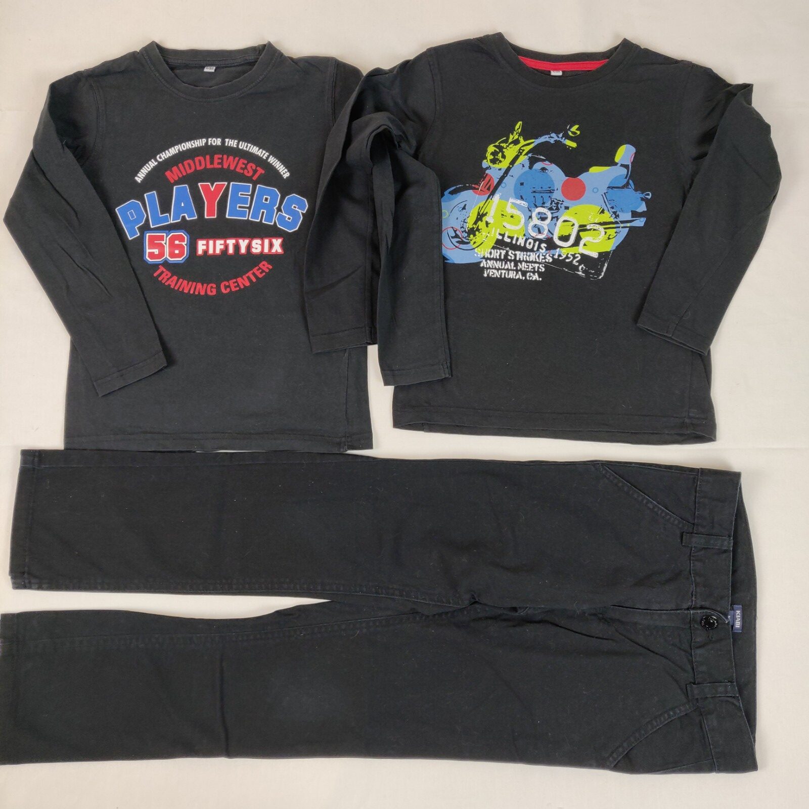 Autres commentaires : Ensemble 3 pièces. T-shirt à manches longues sans marque – noir avec inscription blanche, bleue et rouge « Annual championship for the utlimate winner. Middelwest Players 56 fiftysix. Training center ». T-shirt à manches longues sans marque – noir avec motif muticolore moto. Un jean Kiabi noir. Taille ajustable. Ouverture centrale à zip et à bouton. 2 poches latérales et 2 poches arrières en trompe-l’oeil. Passants pour une ceinture.
