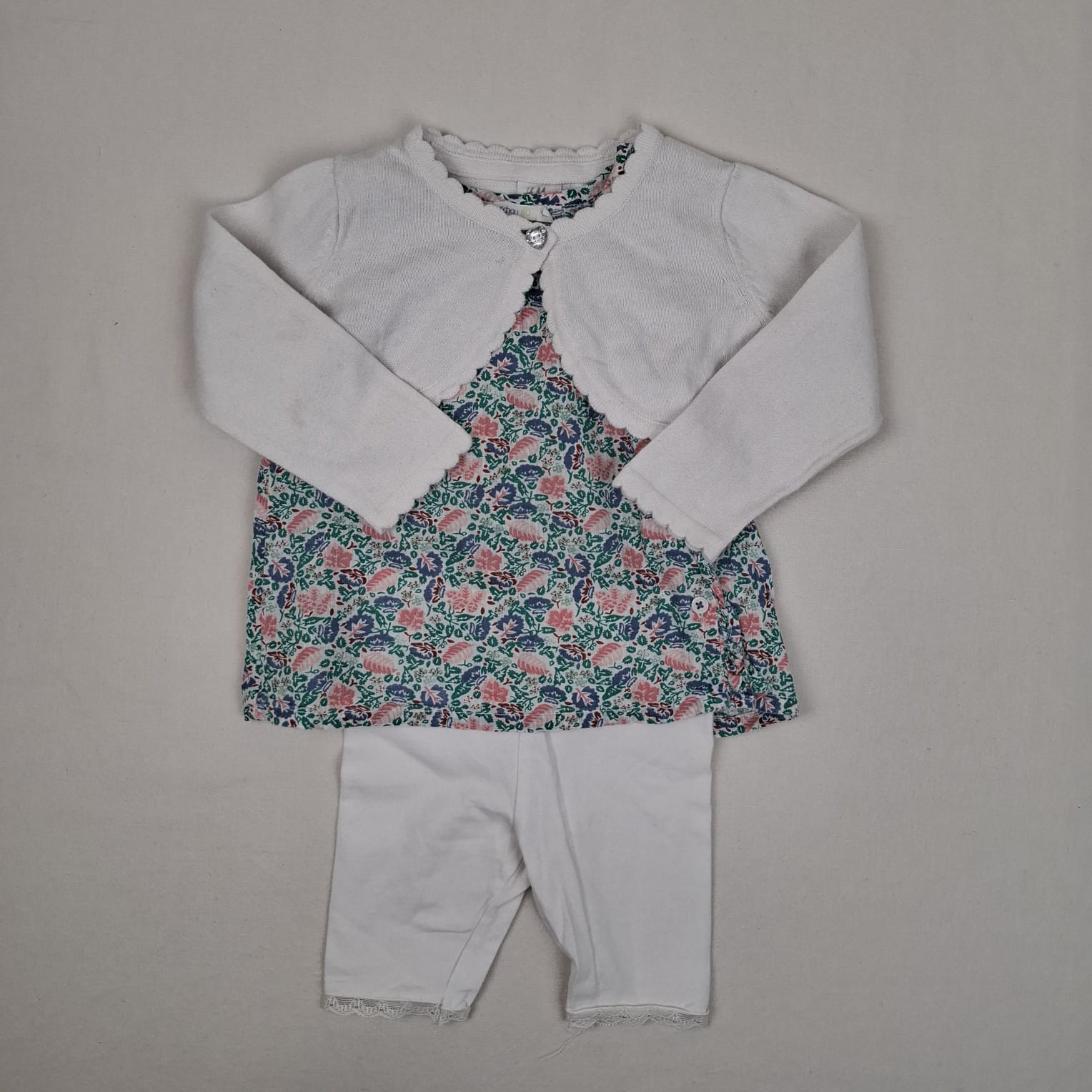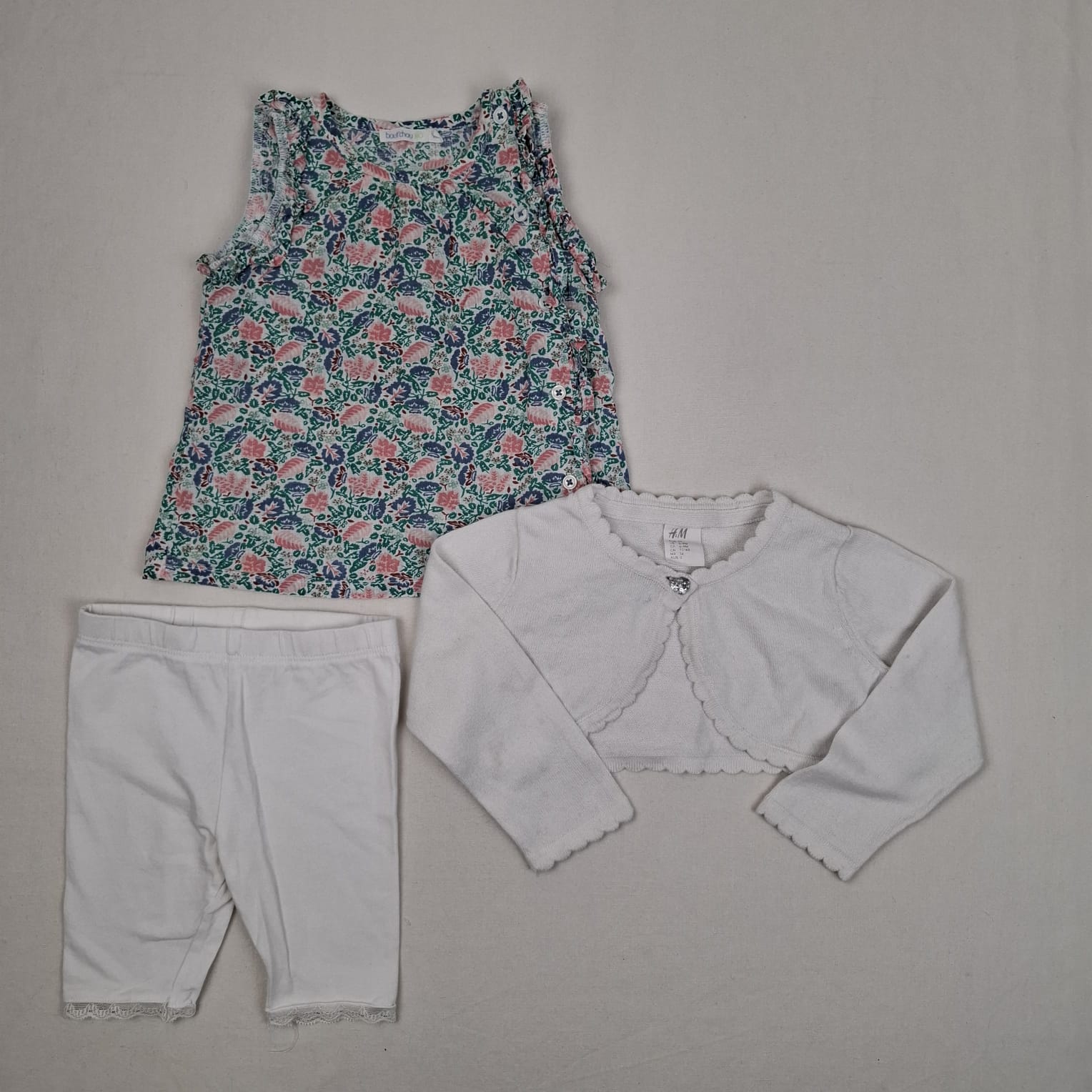 Autres commentaires : Ensemble 3 pièce: -Bolero H&M blanc tricoté, fermeture par bouton. -Tunique Bout’chou blanche àmotif fleuri, col rond, fermeture par boutons à l’avant gauche, 100% coton. -Legging Vertbaudet blanc court, taille élastique, bas dentelle.