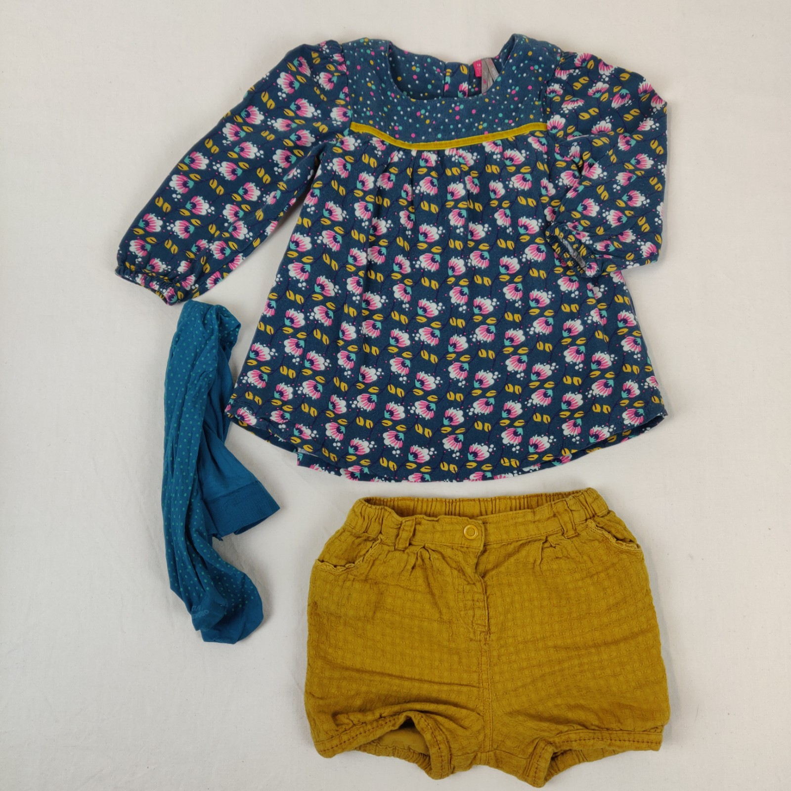 Autres commentaires : Ensemble 3 pièces. Une robe doublée à manches longues – bleu canard. Motifs pois multicolores au niveau de la partie supérieure et motifs floraux au niveau de la partie inférieure. Taille haute marquée par un liseré satiné jaune. Ouverture centrale au dos à 3 boutons. Une paire de collants – bleu à pois verts. Un short – jaune- ocre. Taille ajustable. 2 poches latérales. Passants pour une ceinture.