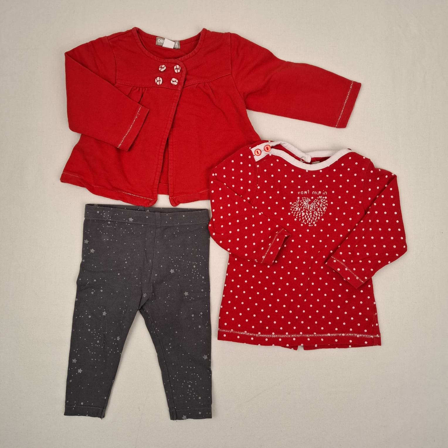 Autres commentaires : 5% élasthanne. Ensemble 3 pièces : – Gilet rouge à manches longues, col rond, fermeture par boutons à l’avant. – T-shirt rouge avec des pois blancs, manches longues, col rond, fermeture par boutons pression au dos. – Legging noir avec des motifs d’étoiles, taille élastiquée.