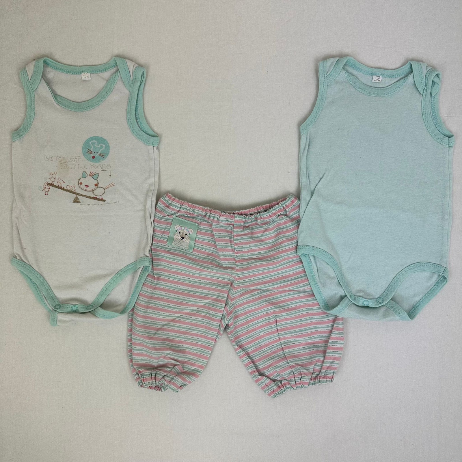 Autres commentaires : 2 body sans manches blanc avec bordures bleu.Pantalon à rayures rose,bleu et blanc avec taille élastiquée.