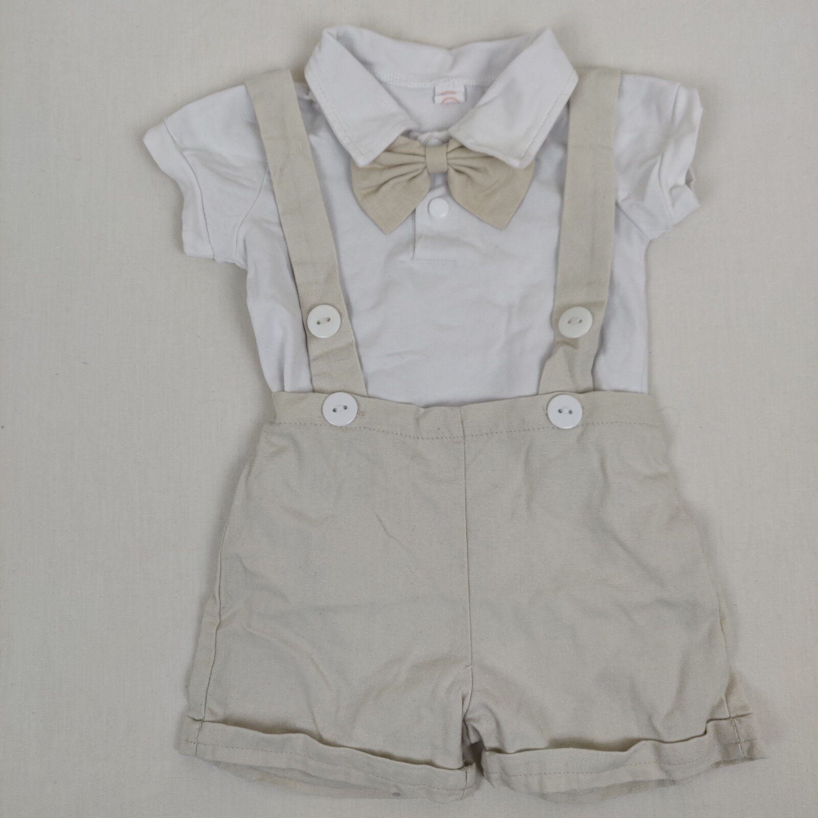 Autres commentaires : Ensemble body blanc (5%élasthanne) et salopette courte écrue (5% polyester) avec leur petit noeud papillon assorti. A croquer ! Dos du short élastiqué, boutons pression au body.