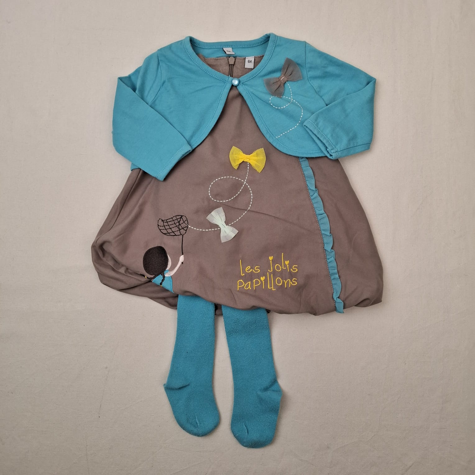 Autres commentaires : Ensemble 3 piéces: – Robe gris marron sans manche, motif fille et inscription « Les jolis papillon », col rond, 100% polyester, doublure en coton 100%. – Bolero bleu turquoise clair, fermeture par bouton, noeud gris marron, 60% coton, 40% polyester. – Collants bleu turquoise clair, 73% coton, 25% polyester, 2% élasthanne.