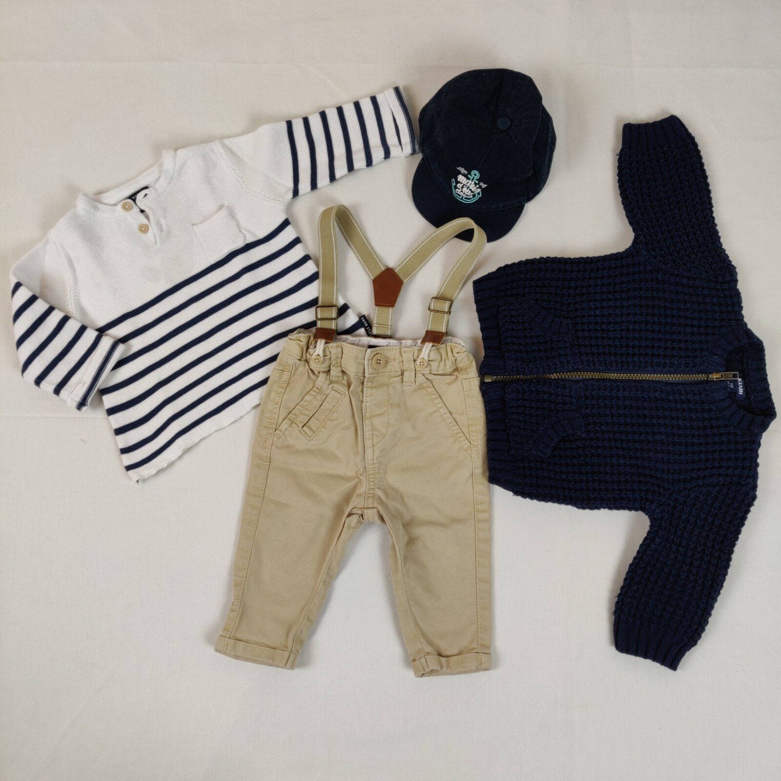 Autres commentaires : Ensemble 4 pièces. Un pull léger motif marin blanc à rayures bleu marine. Ouverture col tunisien. Une pochette centrale. Poignets retroussés. Un pantalon avec des bretelles amovibles beiges (coton majoritaire, 3% élasthanne) – beige. Taille ajustable. 2 poches latérales et 2 poches arrières en trompe-l’oeil. Chevilles retroussées. Gilet en mailles – bleu marine. Ouverture zippée. 2 poches latérales. Léger effet pelucheux. Casquette noire avec motif central ancre marine et inscription « marin d’eau douce ».