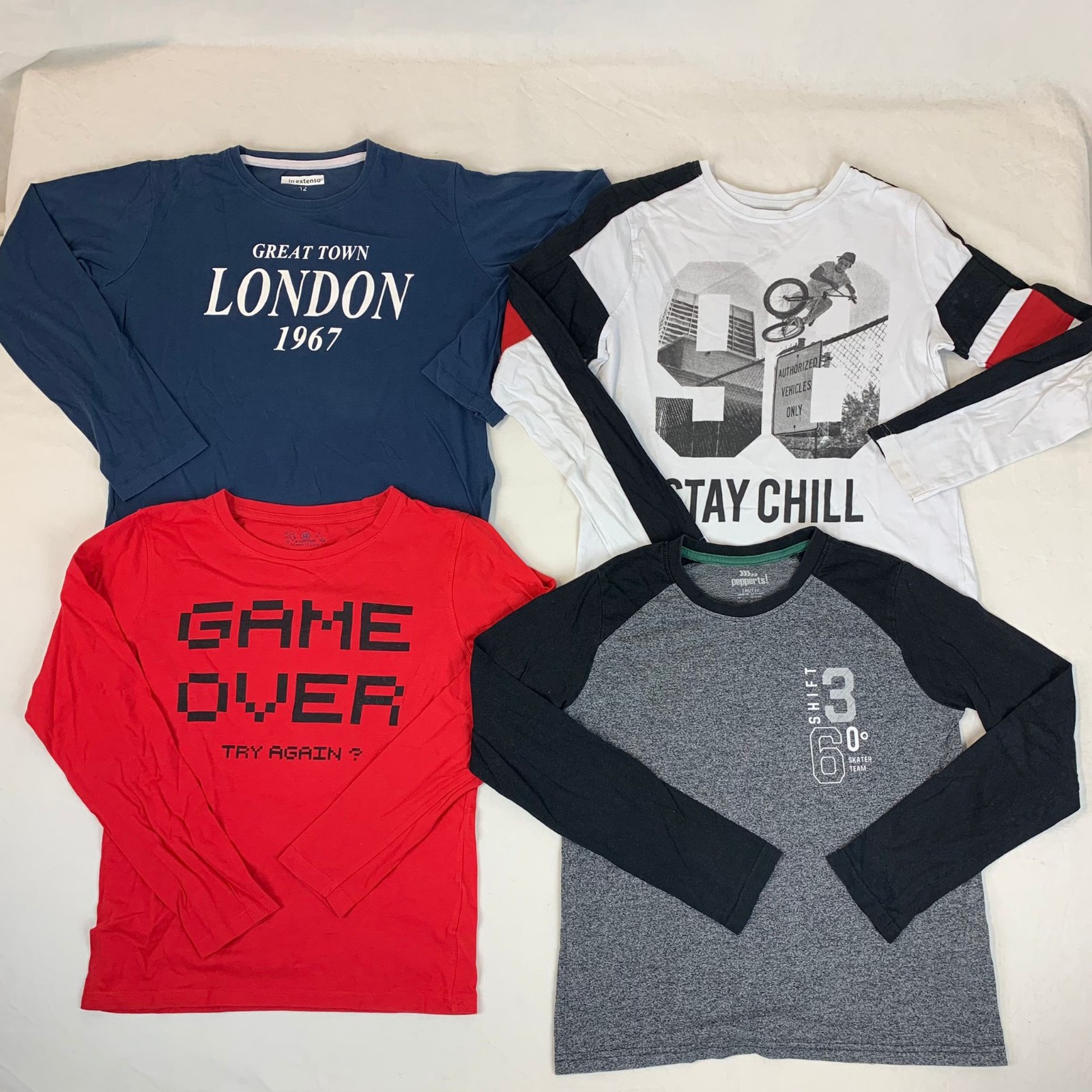 Autres commentaires : Lot :T-shirt blanc Download manches longues avec rayures noir et rouge. T-shirt bleu manches longues In extenso avec ecriture blanc. T-shirt gris Pepperts avec manches longues noir. T-shirt rouge Essentiel manches longues avec écritures noires.