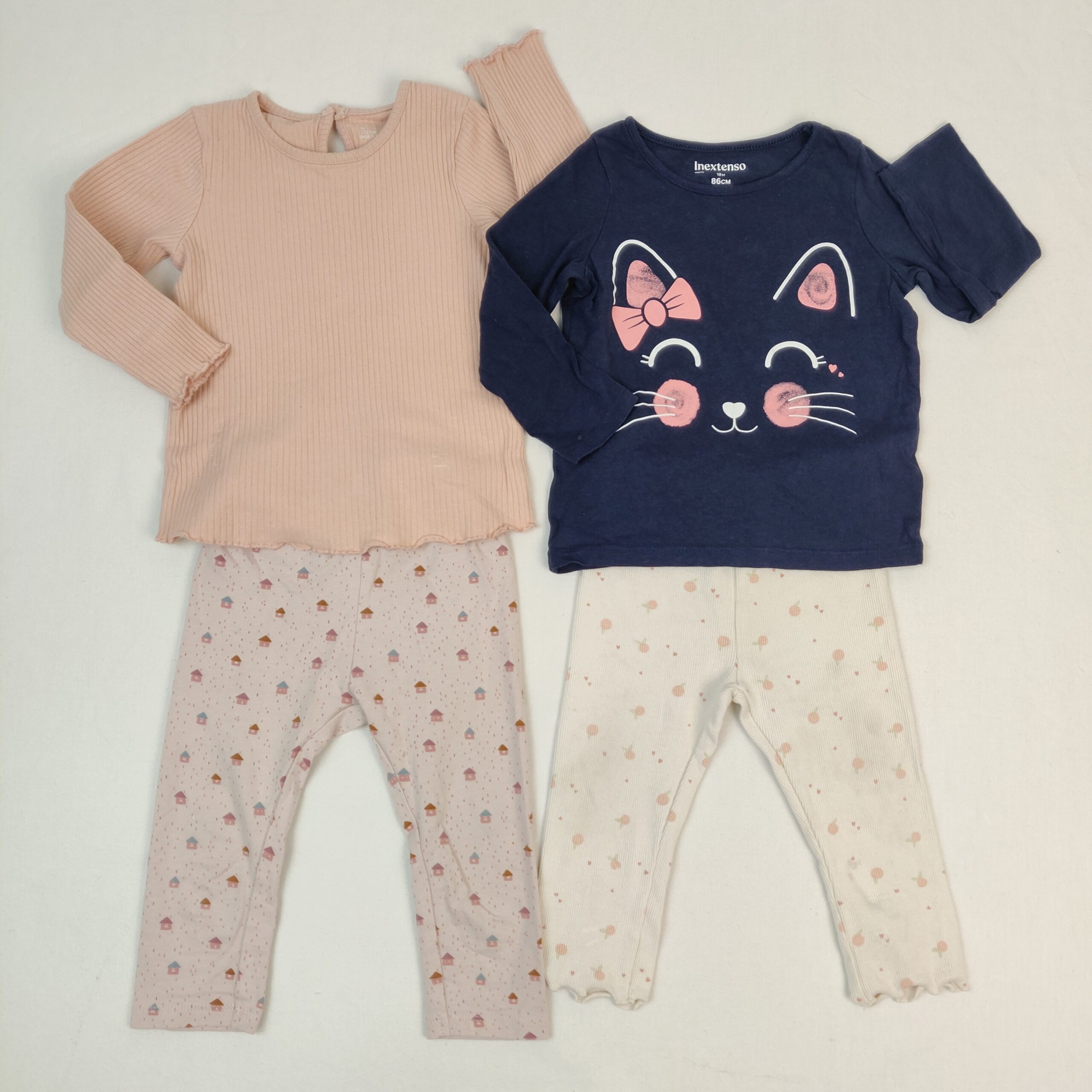 Autres commentaires : Ensemble 4 pièces : – 1 T-shirt beige rosé manches longues PRIMARK en coton côtelé, 5% élasthanne, col rond, fermeture par bouton dans le dos. – 1 T-shirt bleu nuit manches longues In Extenso en jersey de coton, col rond, motif tête de chat blanc et rose – 2 pantalons KIABI dont un rose en jersey de coton, 5% élasthanne, motifs mini-maisons et petits pois, taille élastiquée et un jaune, en coton côtelé, 5% élasthanne, motifs petits coeurs et oranges, taille élastiquée.