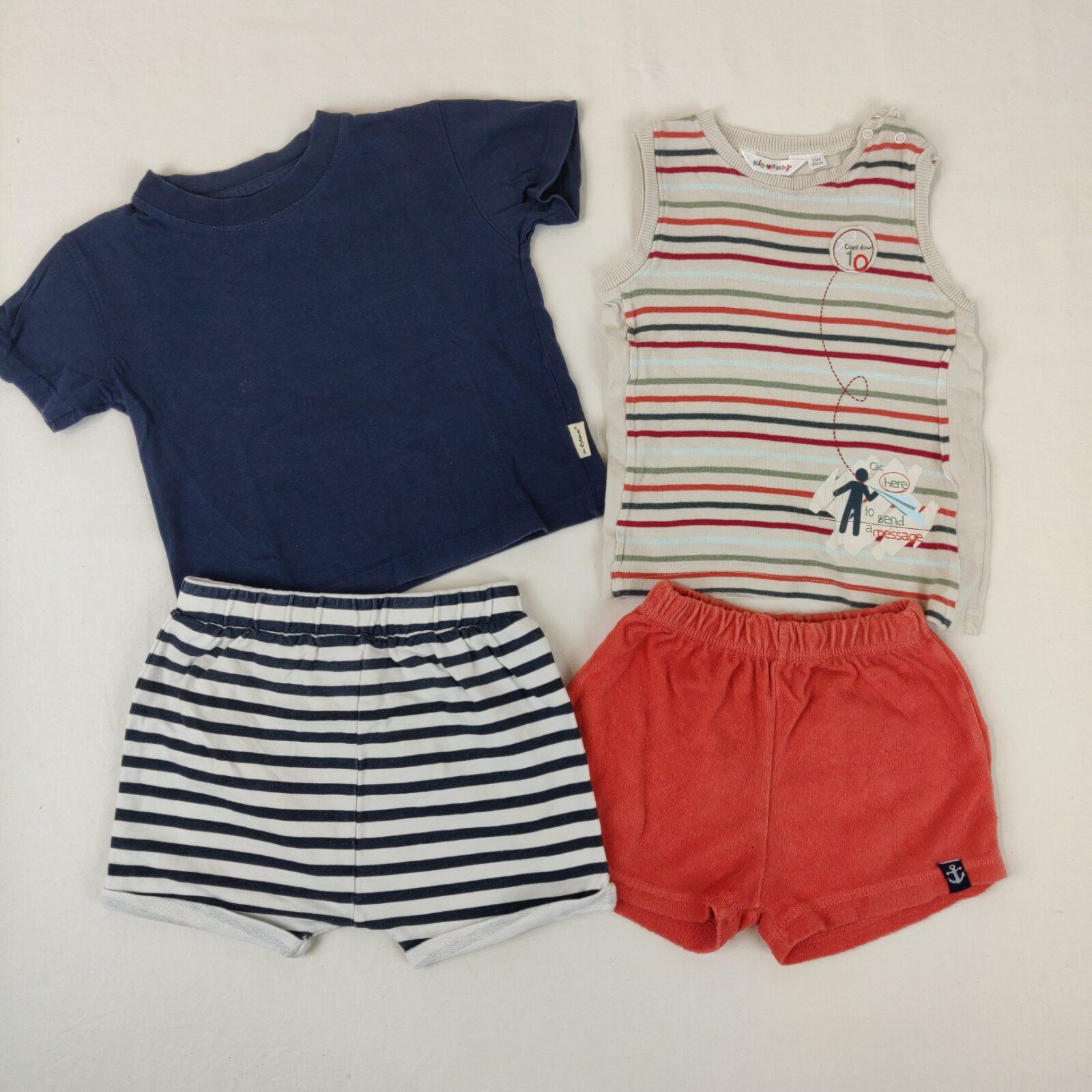 Autres commentaires : Lot de 2 ensembles 2 pièces. Premier ensemble : un t-shirt à manches courtes In extenso uni bleu marine. Un short kiabi blanc à rayures bleu marine. Taille élastique. Second ensemble : un débardeur Kidkanaï beige rayé orange, gris foncé, rouge, bleu et vert. Inscription centrale « Clic here to send a message ». Ouverture latérale à 2 pressions. Un short Tex en éponge orange. Taille élastique.
