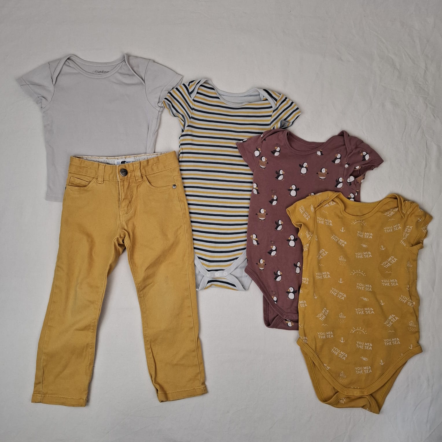 Autres commentaires : Ensemble 4 pièces: -Body C&A à rayures noires, blanches, jaunes, col US, manches courtes, coton 100% . -Body violet gris uni à manches courtes, motif oiseau ,col US, coton 100% . -Body C&A jaune à manches courtes, motif soleil et inscription « You, me é the sea », col US, coton 100%. -T-shirt Kitchoun beige uni à manches courtes, coton 100%. – Pantalon droit TEX jaune offert, ceinture ajustable par élastique intérieur, fermeture par zip et crochet, coton 98% , élasthanne 2%.