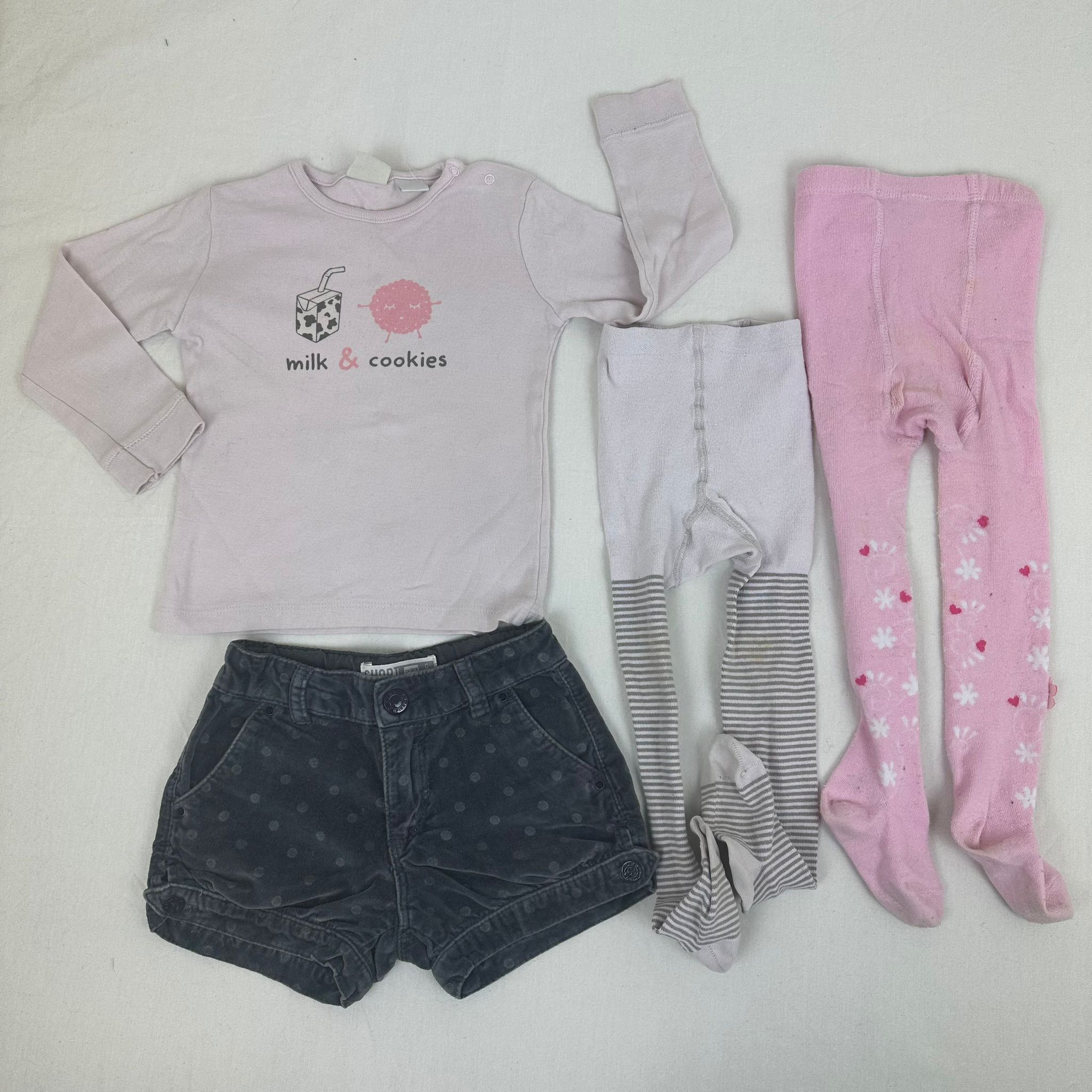 Autres commentaires : Short Okaidi en velours gris avec taille élastiquée et ceinturée. T-shirt Zara manches longues rose avec motif « milk et cookies » et une fermeture par boutons pressions à l’épaule.2 collants rose sans marque avec taille élastiquée.