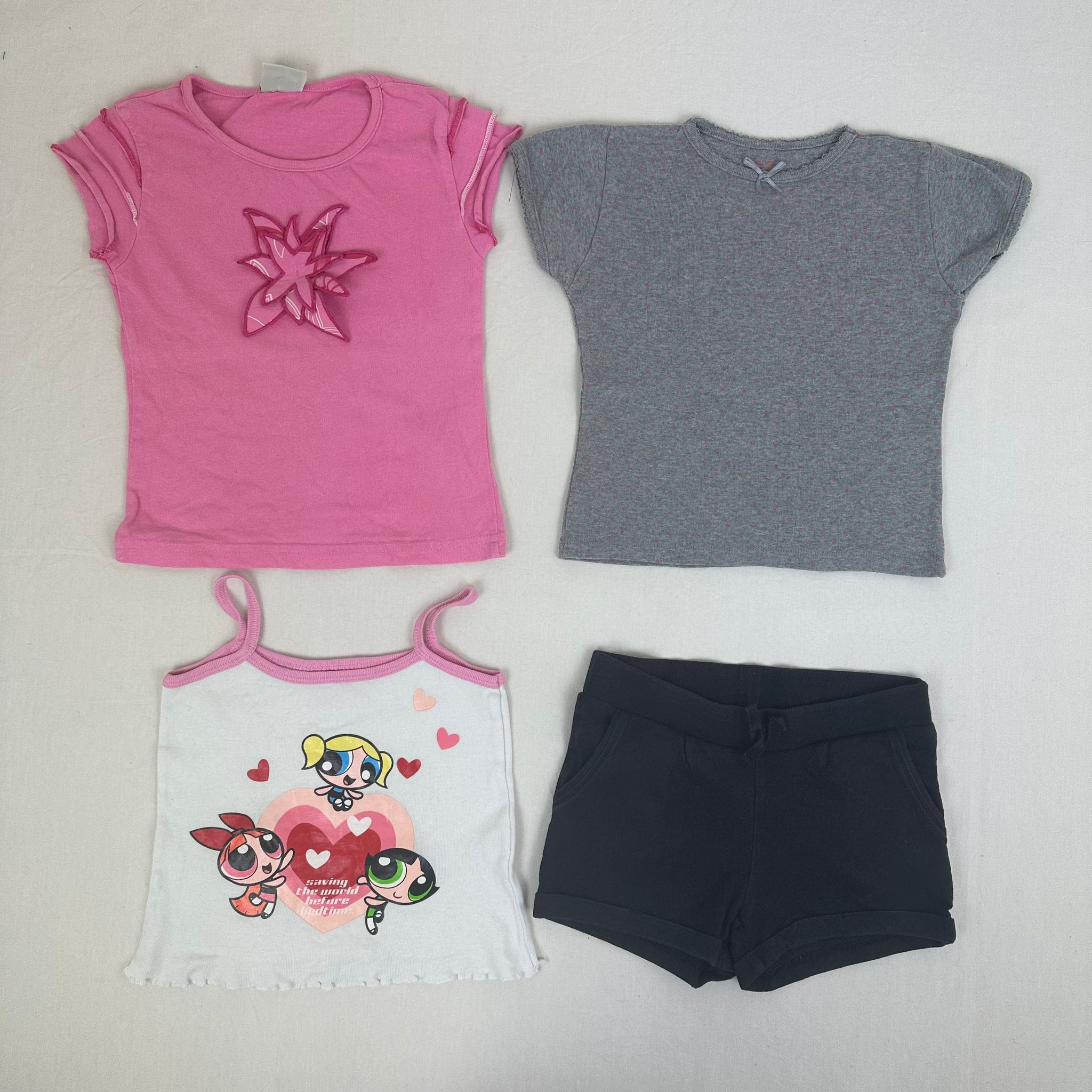 Autres commentaires : Short noir C&A. Debardeur blanc et rose avec motif les puff girls.T-shirt CFK gris macnhes courtes avec des points rose.T-shirt In Extenso rose manches courtes avec motif fleurs.